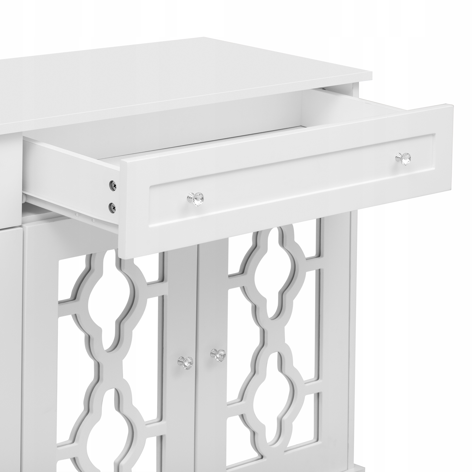 Цей стильний дзеркальний комод поєднує в собі елегантність і практичність, що робить його ідеальним для будь-якого інтер’єру. Його розміри становлять 140 см (Д) x 83 см (В) x 40 см (Ш), а чотири вражаючі дзеркальні дверцята ідеально відображають оточення, створюючи художній ефект і додаючи нотку стилю вашому дому. Регульовані полиці за дверцятами пропонують гнучкі варіанти зберігання для різноманітних потреб, від книг і посуду до декоративних предметів. Комод також має дві довгі шухляди, які забезпечують додатковий прихований простір для зберігання необхідних речей, забезпечуючи при цьому приватність. Виготовлений з високоякісної ДВП середньої щільності (МДФ), комод є міцним і структурно міцним. Його елегантний дзеркальний дизайн і різноманітні варіанти зберігання ідеально поєднують практичність із сучасним стилем, легко інтегруючись у вашу вітальню, їдальню чи коридор. Цей комод ідеально підходить для тих, хто хоче покращити свій інтер’єр вишуканим декором, збільшуючи при цьому простір для зберігання.