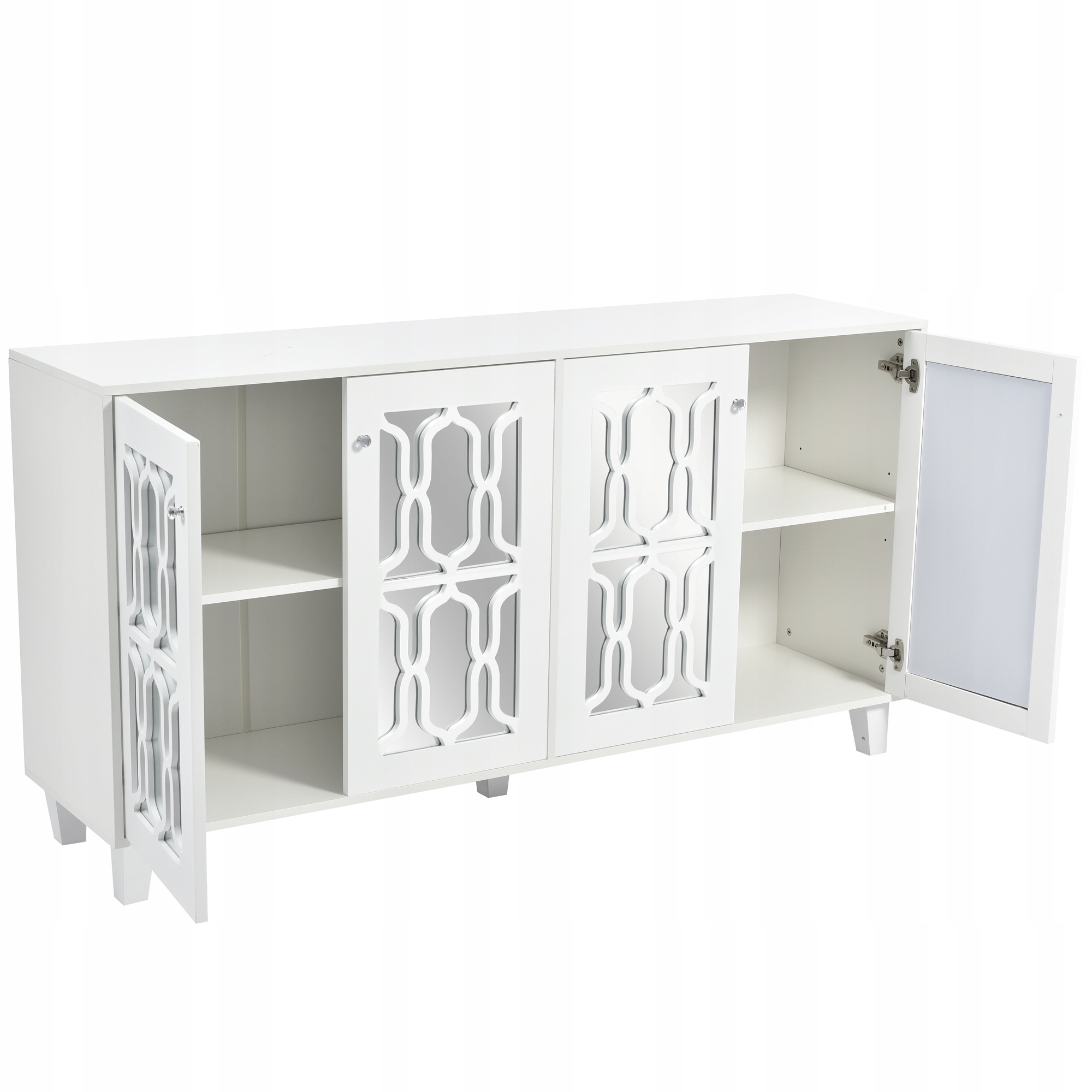 Білий, дзеркальний комод з ефектними кришталевими ручками, чотири дверцята, з рухомим ламінатом. Для вітальні та їдальні 160 х 40 х 84 см.
