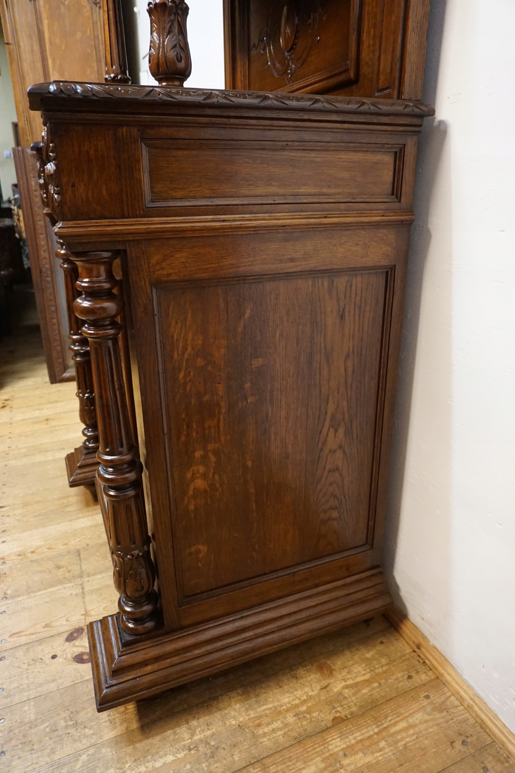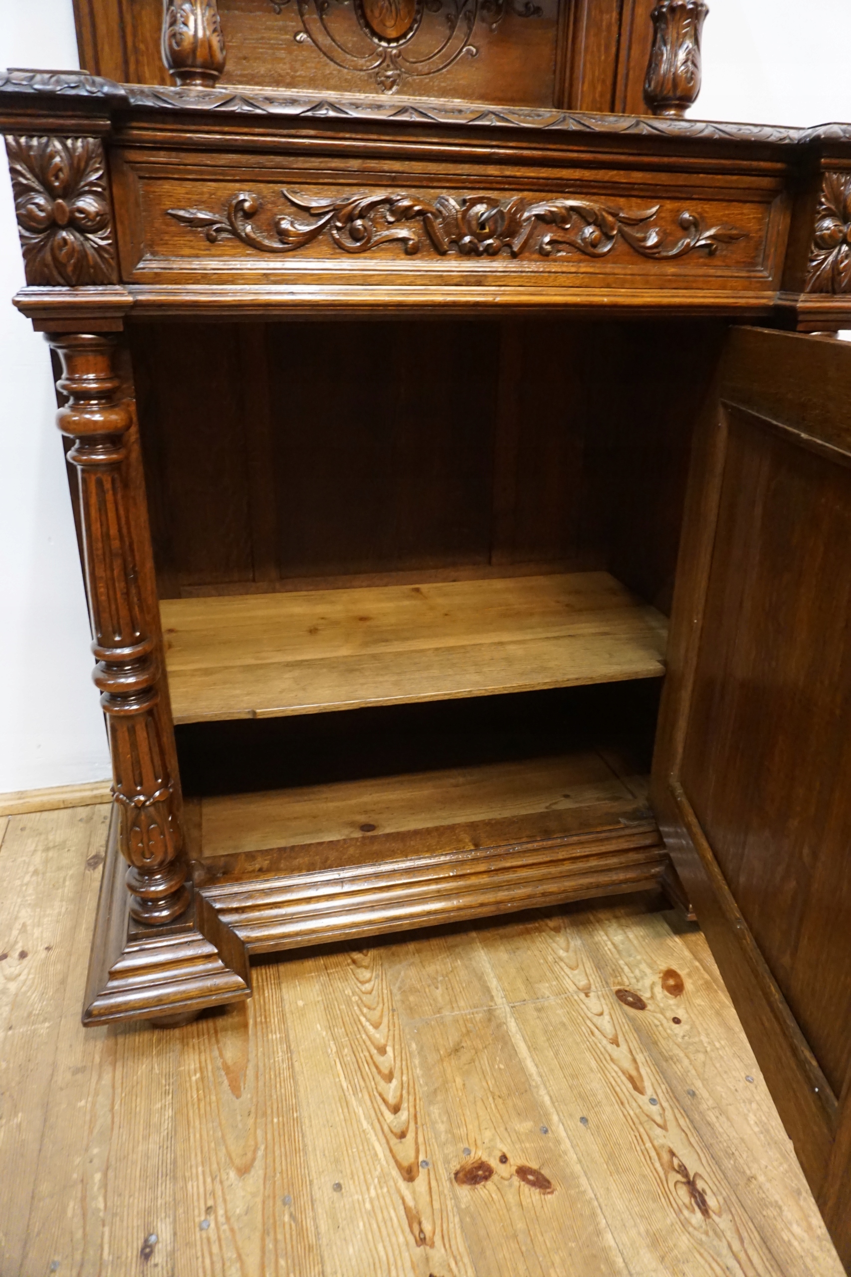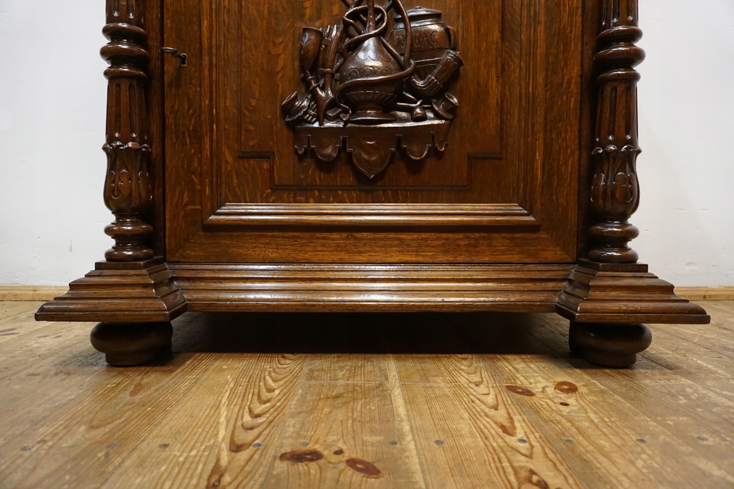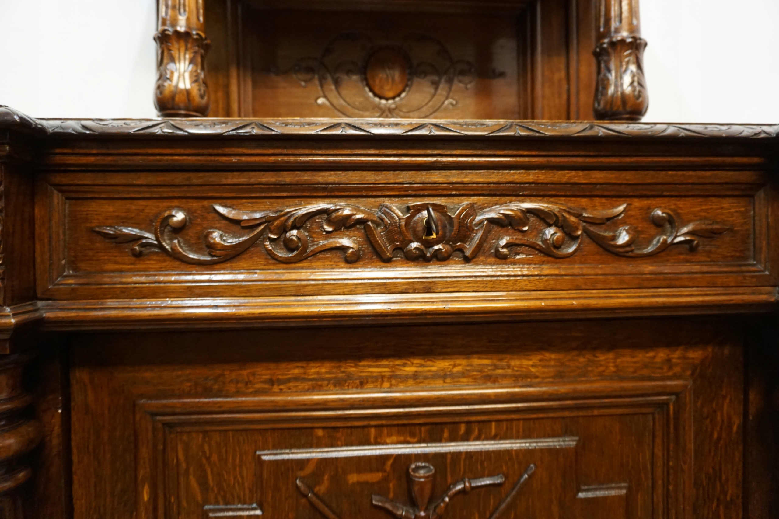 Унікальна тумба в стилі неоренесанс, виготовлена з масиву дуба, який є чудовим зразком майстерності різьби по дереву кінця 19 століття. Цей репрезентативний предмет меблів з гідною формою та чоловічим характером, ймовірно, був призначений для елегантної вітальні для курців, яка колись була символом доброго смаку та соціального престижу.