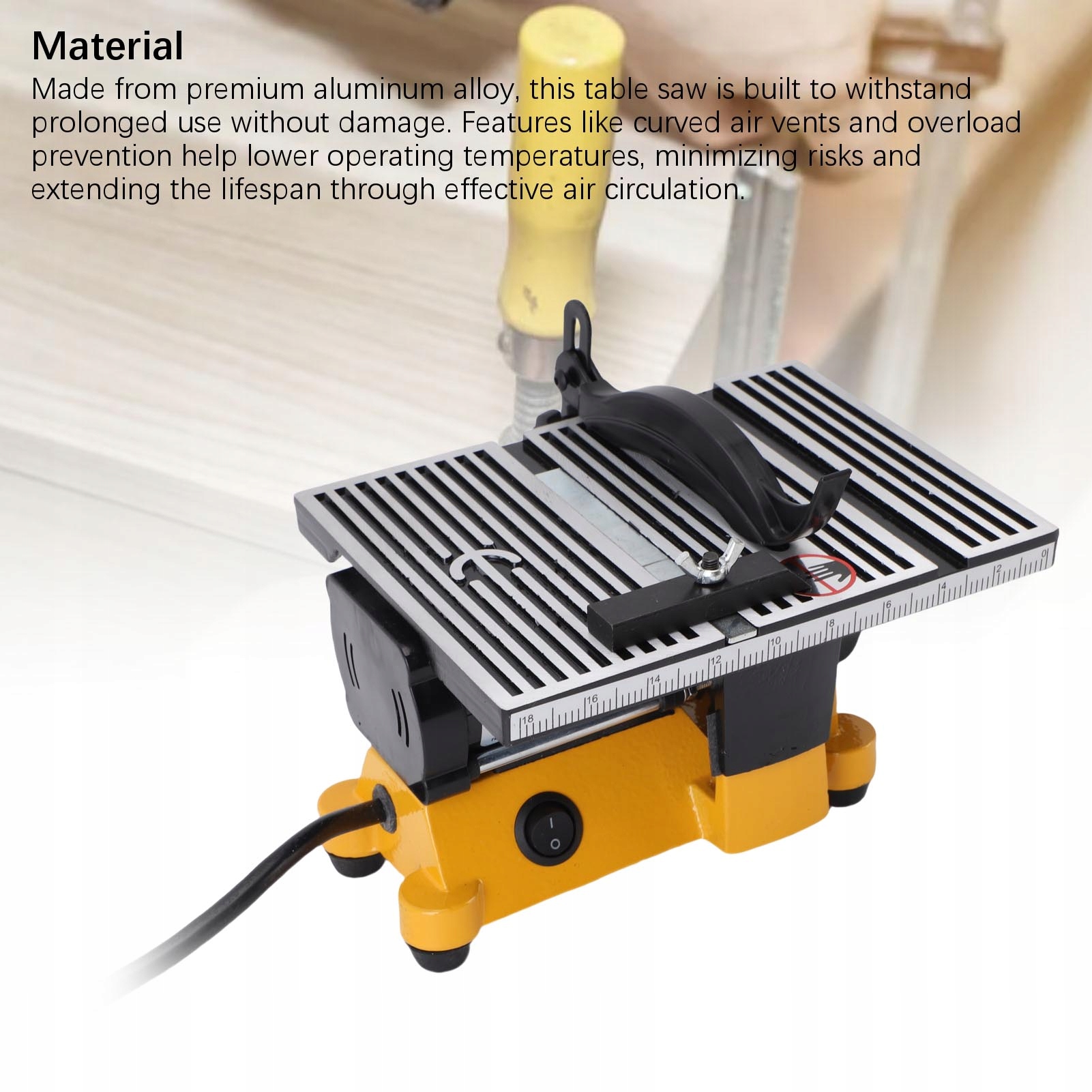 5. Матеріал: виготовлена з високоякісного алюмінієвого сплаву, ця настільна пила витримує тривале використання без пошкоджень. Такі функції, як вигнуті вентиляційні отвори та запобігання перевантаженню, допомагають знизити робочу температуру, мінімізуючи ризик і збільшуючи довжину завдяки ефективній циркуляції повітря.