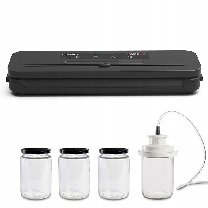 Практичний набір з вакуумним пакувальним апаратом COMPACT, оснащений насадкою для закривання звичайні скляні банки та їх повний комплект (6 шматки). Насадка у вигляді спеціальної насадки дозволяє швидко видалити повітря зсередини банки. Цей процес відбувається в режимі закриття контейнера.