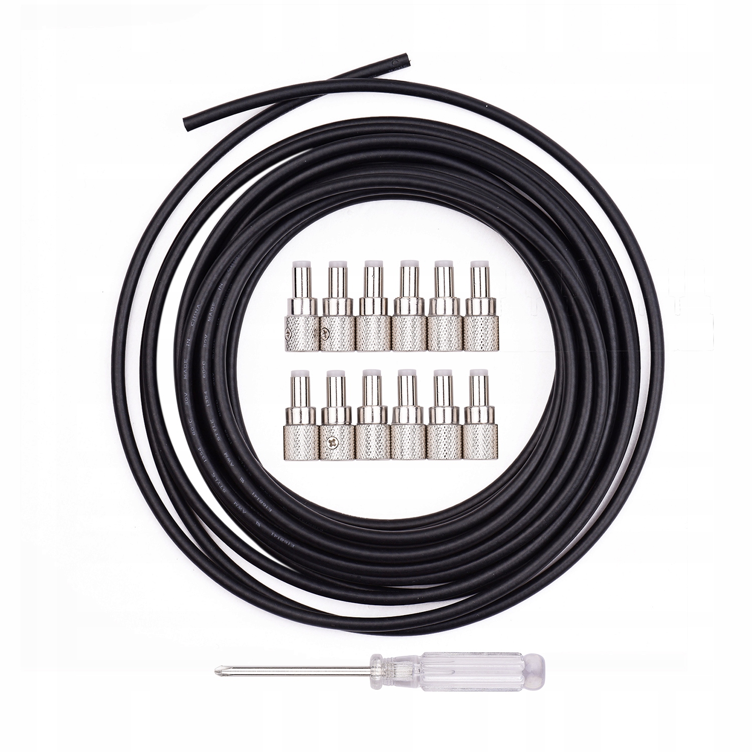 Набір для пайки кабелю постійного струму включає 12 штекерів, 5 м кабелю та міні-викрутку.