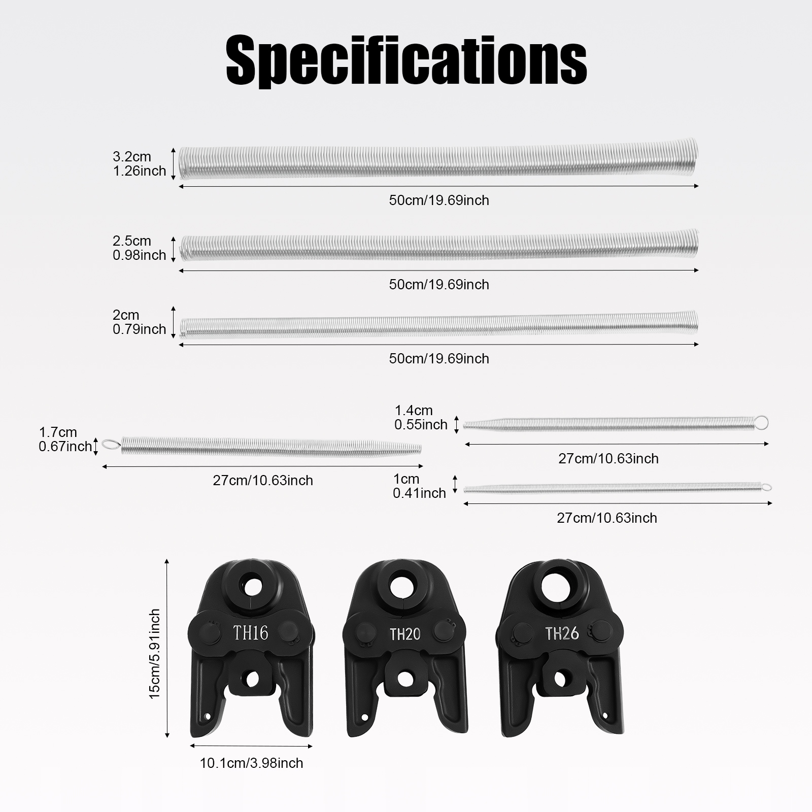 Розмір згинальної пружини (D*H): 10,5*270 мм/0,41*10,63 дюйма, 14*270 мм/0,55*10,63 дюйма, 17*270 мм/0,67*10,63 дюйма, 20*500 мм/0,79*19,69 дюйма, 25*500 мм/0,98*19,69 дюймів, 32*500 мм/1,26*19,69 дюймів.