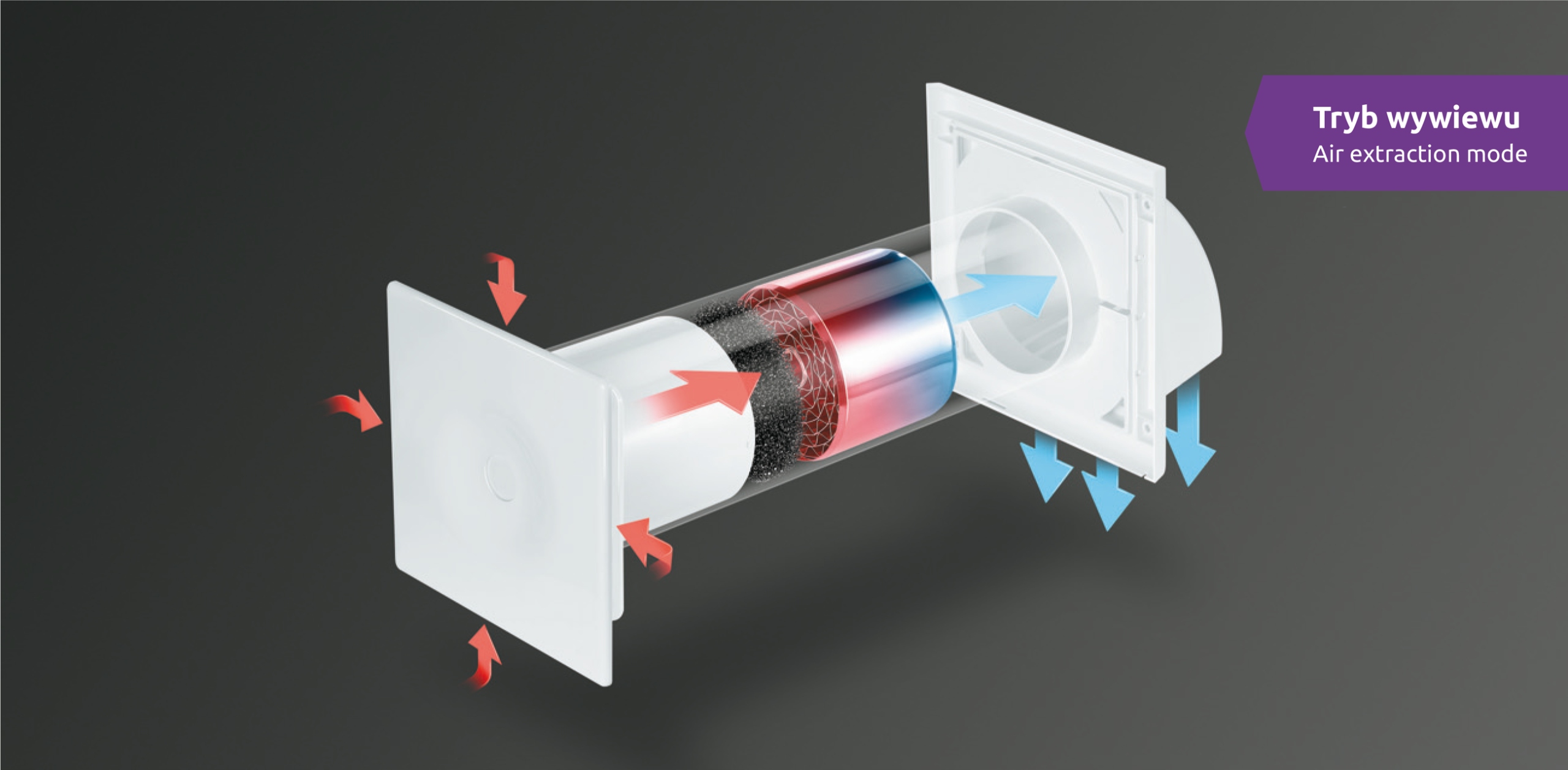 Він оснащений накопичувальним теплообмінником, завданням якого є збір і віддача (рекуперація) теплової енергії в процесі витяжки і подачі повітря з приміщення, в якому він встановлений.