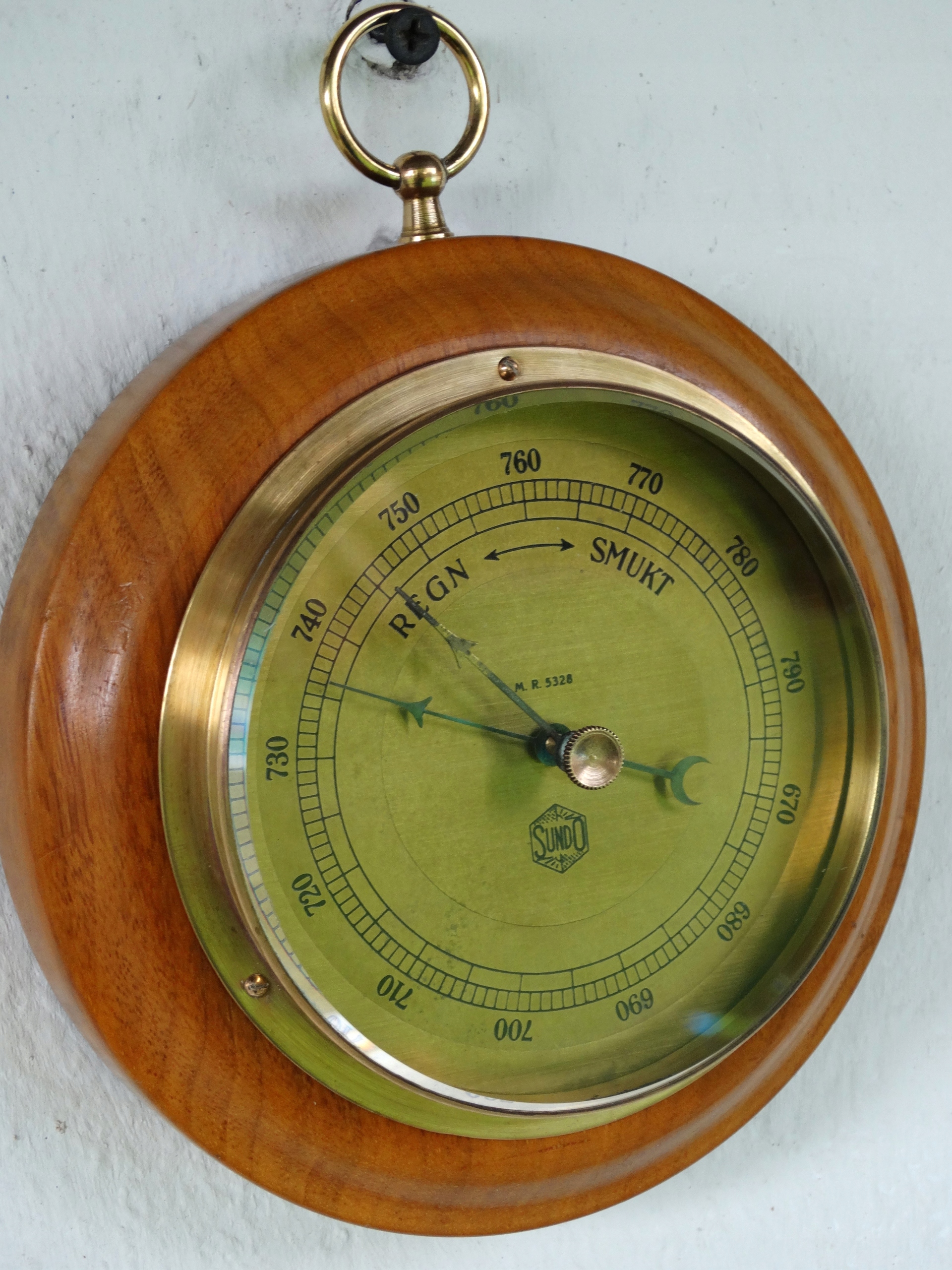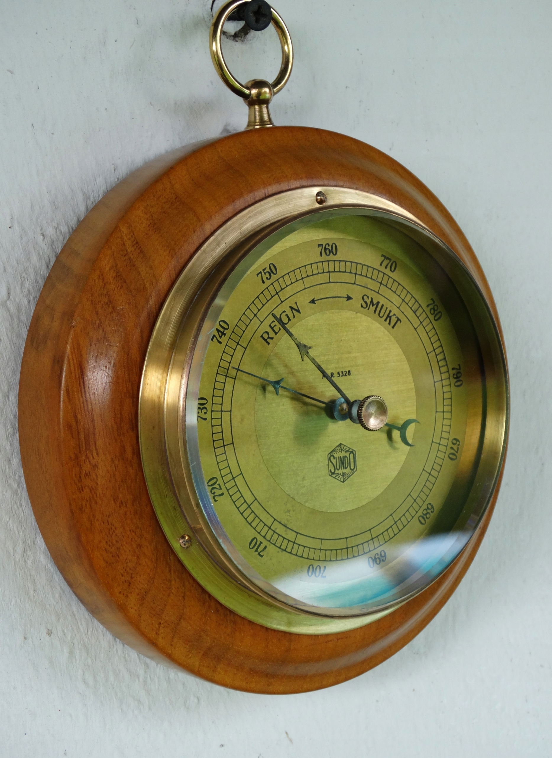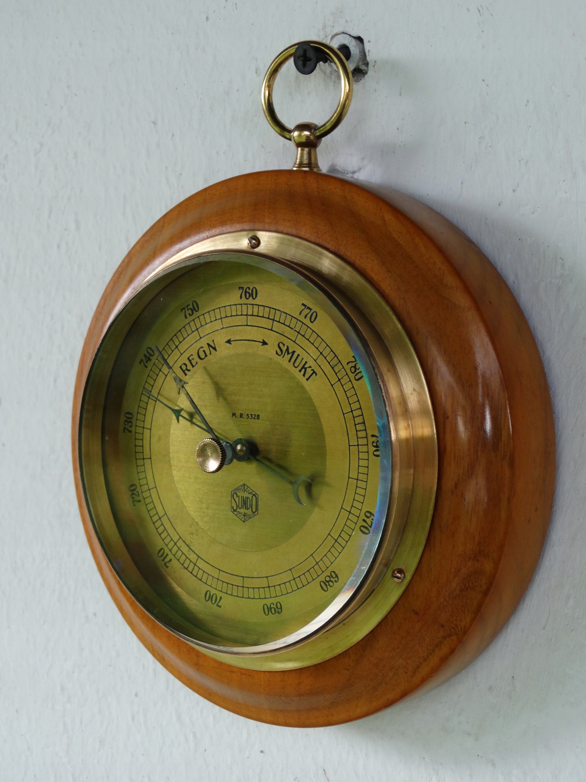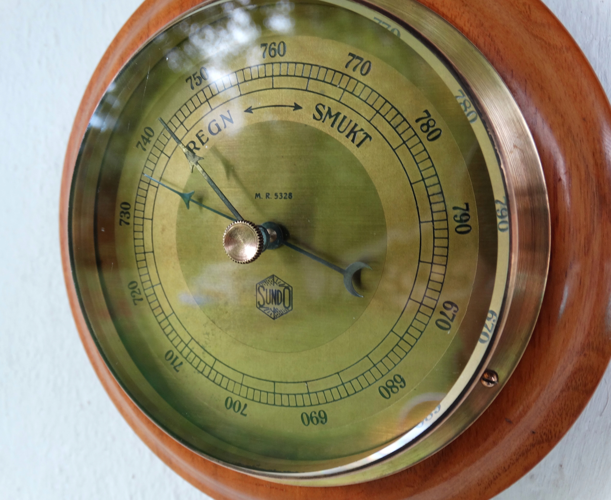 Барометр-компас у дерев'яній оправі з латунними аксесуарами, підпис SUNDO.