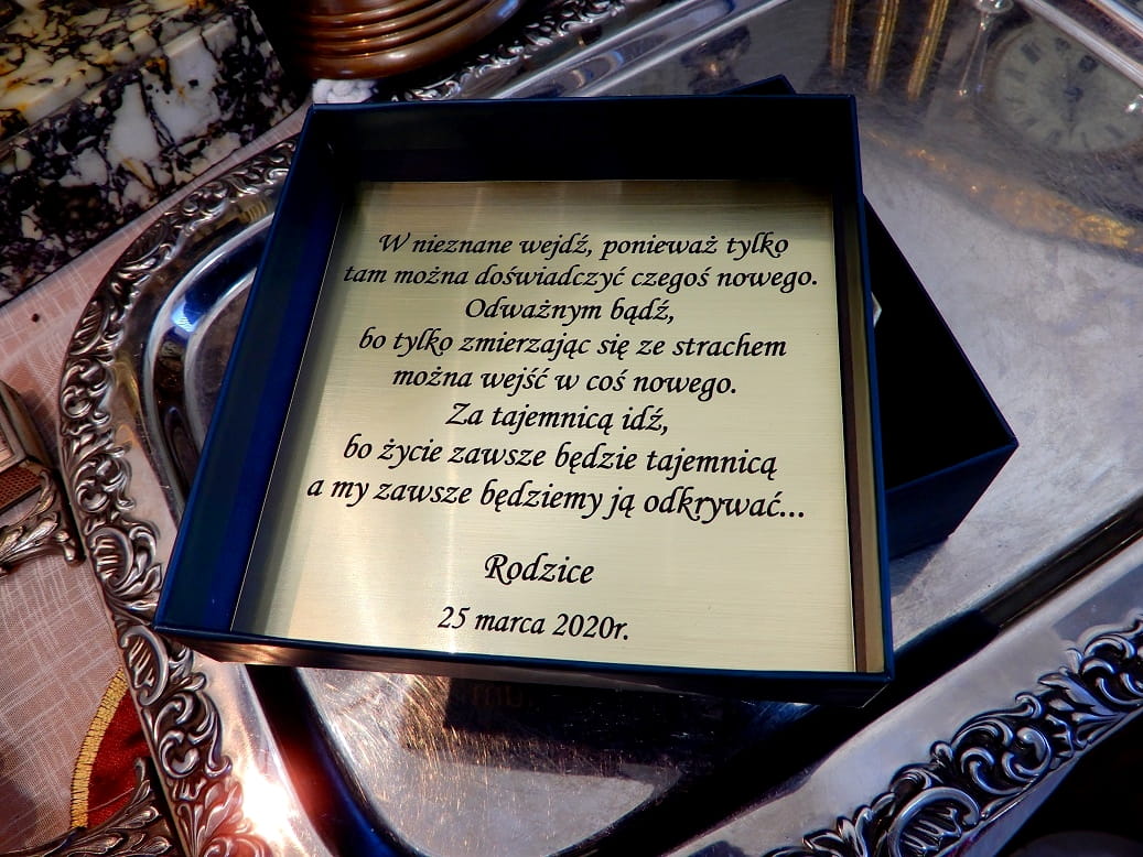 Ми можемо вклеїти в кришку коробки ламіновану пластину з золотим гравіюванням з вашою присвятою. Подивіться приклад. Фото