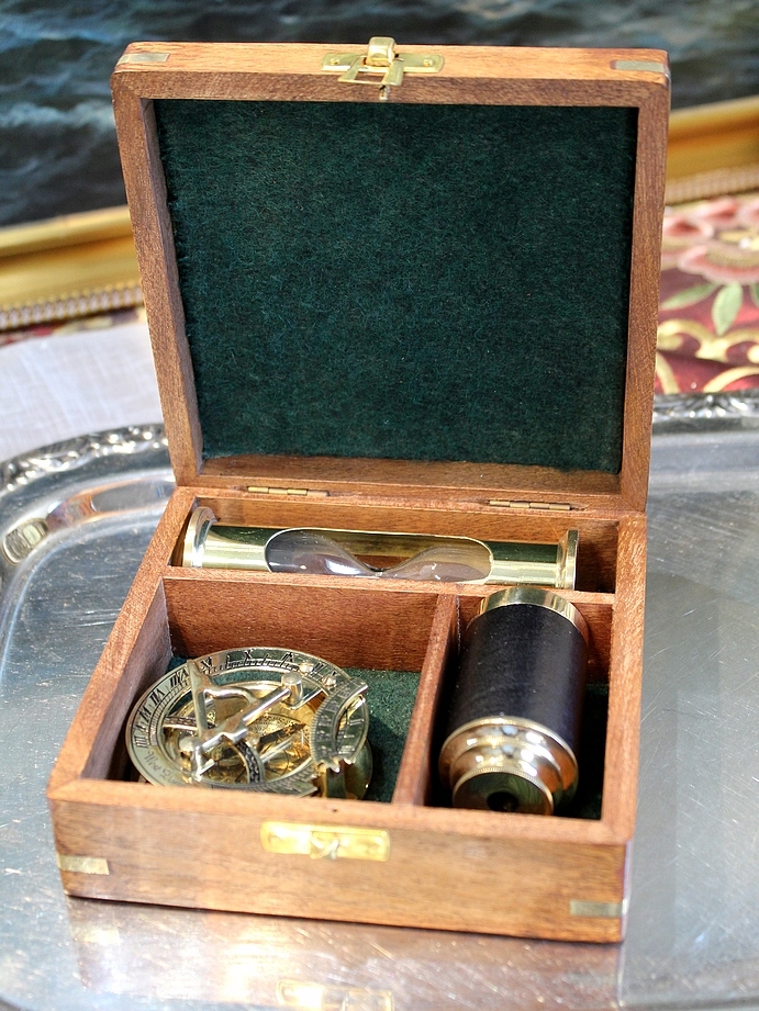 Стилізований подарунковий набір у дерев'яній коробці, що містить три елементи, що відсилають до класичних навігаційних інструментів: сонячний годинник з компасом, складний телескоп і пісочний годинник у латунній оправі.