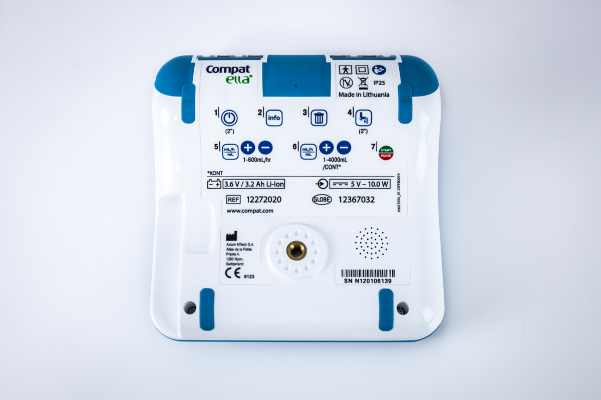 - Ємність акумулятора дозволяє працювати протягом усього дня (зі швидкістю постачання 125 мл/годину)