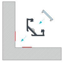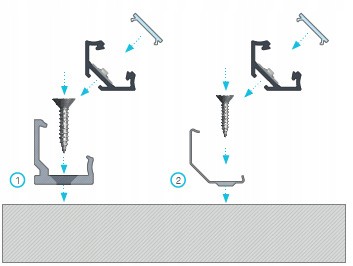 Кінцевий результат монтажу кутового C-профілю з кришкою BASIC за допомогою (1) пластикового монтажного кронштейна CH, (2) металевого монтажного кронштейна CH.