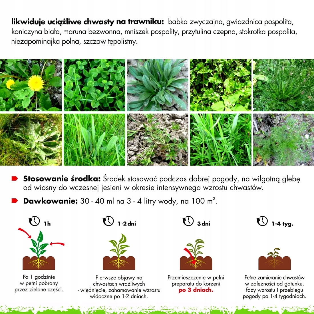 доза 3,5 л/га: чутливі бур’яни: бабуся -ліцтовка, звичайна бабуся, звичайне лезо звичайних, великих -зірка, польові залози, гострий віне, фіолетовий яснот, Джейстзебік Коловер, Meadow, Meadow Clover, Meadow Clover, Meadow Clover, Meadow Clover, Meadow Clover Кульбаба, польова заливка, зелена пупка, звичайна кропива, грубий прокурор, польовий швидкісний, канадський пригод, затишна, звичайна рогівка, польовий печей, кучерявий щавель, польовий щавель, генерал -щавель, звичайний щавель, загальна татура і вузька забарвлена. Середньостійкі бур’яни: звичайна яррова, персидська швидкісна.