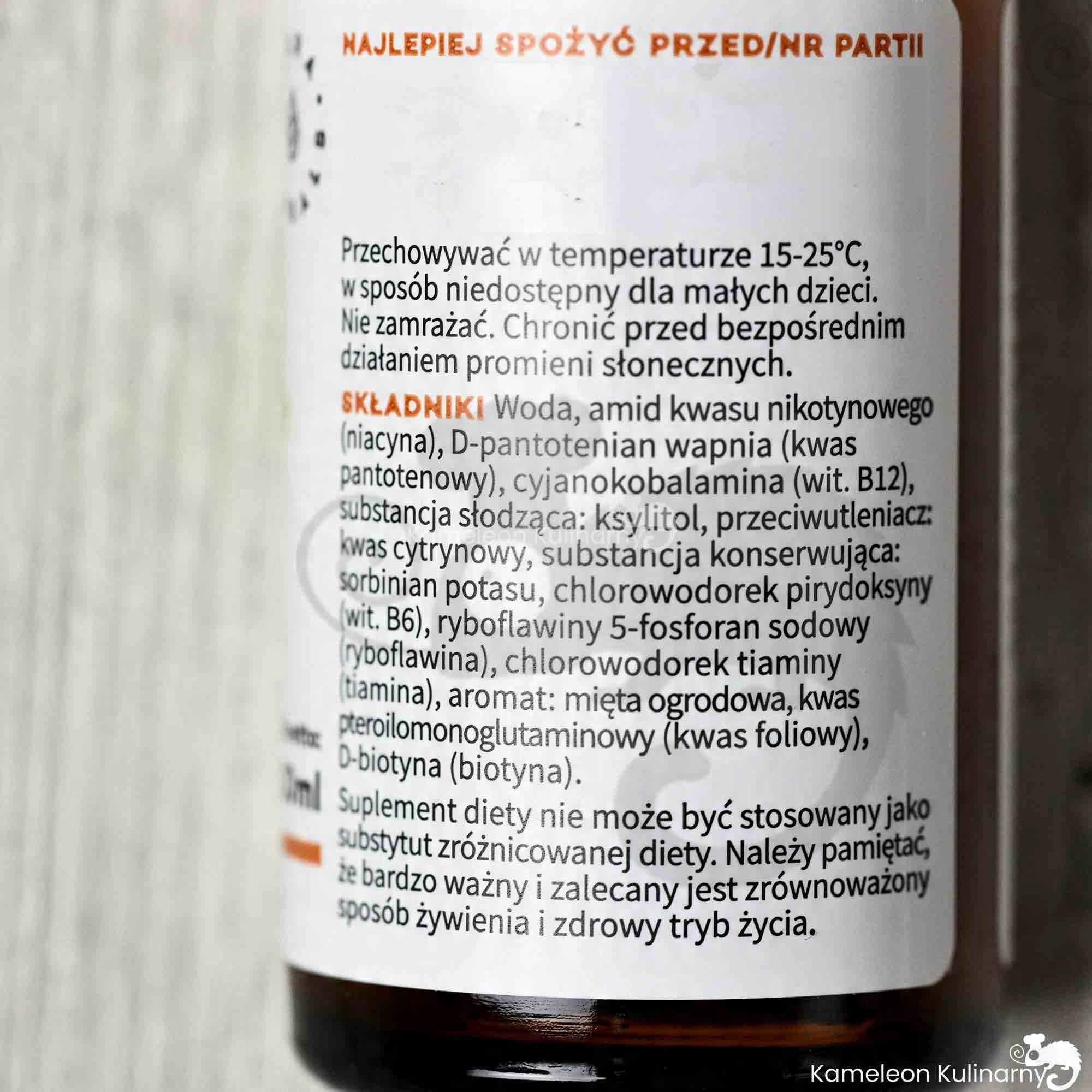 Інгредієнти - Вода, нікотинамід (ніацин), D-пантотенат кальцію (пантотенова кислота), ціанокобаламін (вітамін B12), підсолоджувач: ксиліт, антиоксидант: лимонна кислота, консервант: сорбат калію, піридоксину гідрохлорид (вітамін B6), рибофлавін 5'-фосфат натрію (рибофлавін), тіаміну гідрохлорид (тіамін), ароматизатор: м'ята, птероїлмоноглутамінова кислота (фолієва кислота) , D-biotin (біотин).