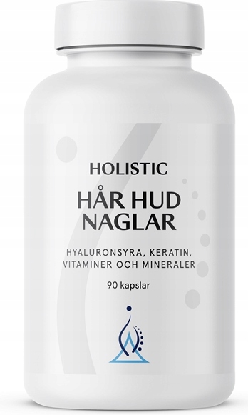 Holistic Hår Hud Naglar - це дієтична добавка, що містить гіалуронову кислоту (Haplex plus®), кератин овечої вовни (Cynatine®), натуральний кремній з екстракту бамбука, вітамін С, цинк, селен, мідь, біотин, вітамін А, ніацин, рибофлавін і йод.
