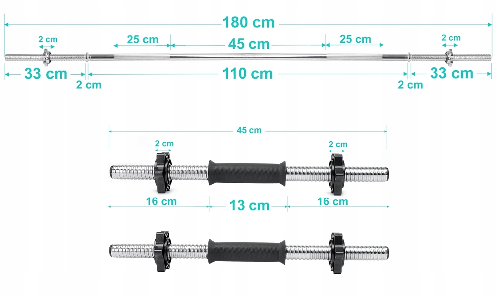 - 2 x штанга 45 см fi 25 мм із затискачами - макс. вантажопідйомність штанги 20кг