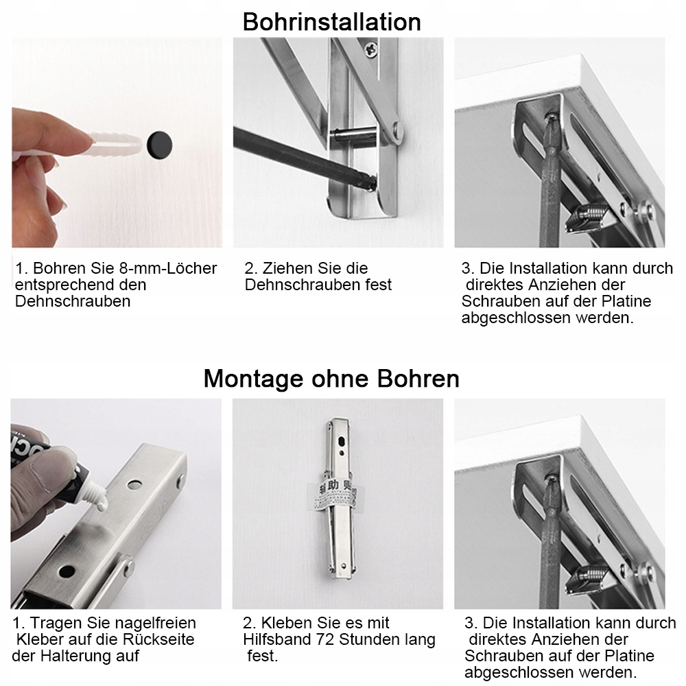 ⏺【 304 Добові подряпини з нержавіючої сталі, корозія або матування та залишаються такими ж яскравими, як нові. Примітка: Дошки використовуються лише для демонстраційних цілей, вони не прикріплені. Щоб нахилити стіл зі стіни, просто натисніть на випуск руки. Дерев’яні полиці можна легко повісити на стіну. Це дозволяє зберігати порядок у кімнаті. Його можна встановити на будь -якому типі стіни без пошкоджень. Він містить 6 високоякісних гвинтів з нержавіючої сталі та 6 розвідувальних труб. Ідеально підходить для магазинів, майстер -класів, прання, човнів, будинків, дворів, причепів, номерів, кухні, балконів, ванних кімнат тощо.
