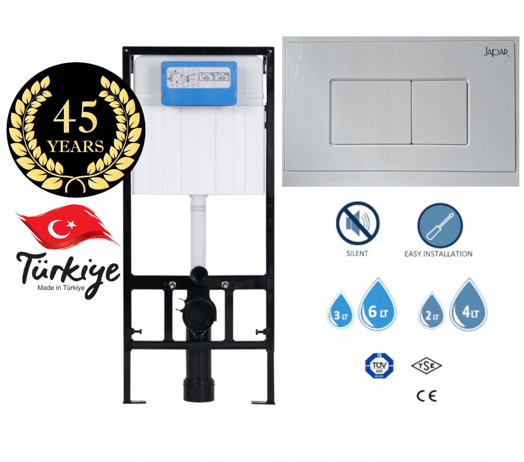 Набір поєднує тихий, компактний прихований бачок, елегантну раму унітазу та стильну білу панель змиву. Завдяки ефективній системі змиву з двома об'ємами води (3/6 л) це ідеальне рішення для нового будівництва, ремонту або заміни туалету. Промивання двома об’ємами води економить воду та захищає навколишнє середовище.