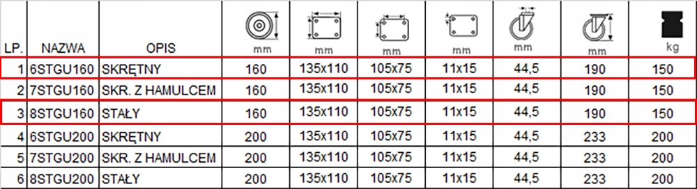 Набір містить чотири колеса, закріплені на шпильці. Два колеса без гальма, код 6STGU160/40, в таблиці під п.1, і два нерухомих колеса, код 8STGU160/40, в таблиці під п.3.
