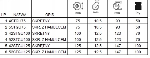 Набір складається з чотирьох коліс, оснащених пластиною. У комплект входять два поворотних колеса код 4STGU100 (поз. 3 у таблиці) та два поворотних колеса з гальмом код 5STGU100 (поз. 4 у таблиці). p >