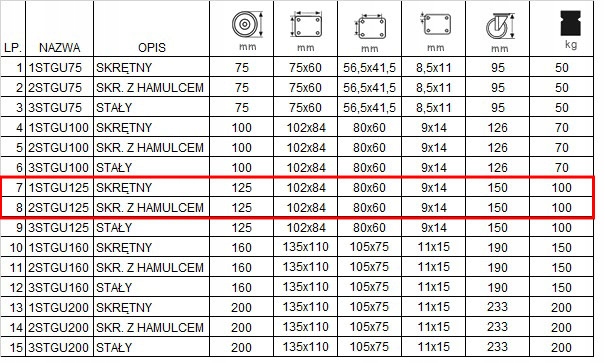 Набір складається з чотирьох коліс, оснащених пластиною. У комплект входять два поворотних колеса код 1STGU125 (поз. 7 у таблиці) та два поворотних колеса з гальмом код 2STGU125 (поз. 8 у таблиці). p >
