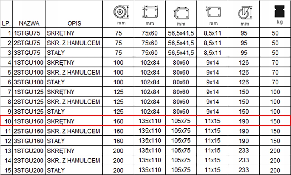 Набір складається з чотирьох коліс, оснащених пластиною для кріплення. У комплекті чотири колеса з кодом 1STGU160 (поз. 10 у таблиці).