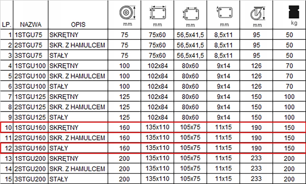 Набір складається з чотирьох коліс, оснащених пластиною для кріплення. У набір входять два фіксованих комплекти з кодом 3STGU160 (поз. 12 в таблиці) і два поворотних колеса з кодом 1STGU160 (поз. 10 в таблиці).