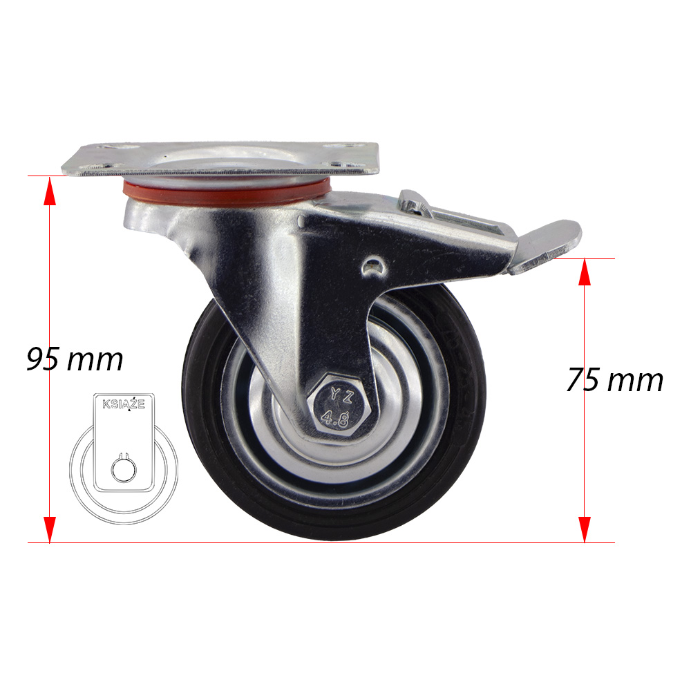 - КОРПУС виготовлений з листової сталі високої міцності. Плитка має розміри 75х60 мм. Колеса мають діаметр 75 мм, центри кріплення 56,5 х 41,5 мм, а овальні отвори кріплення 11 х 8,5 мм. Загальна висота 95 мм.
