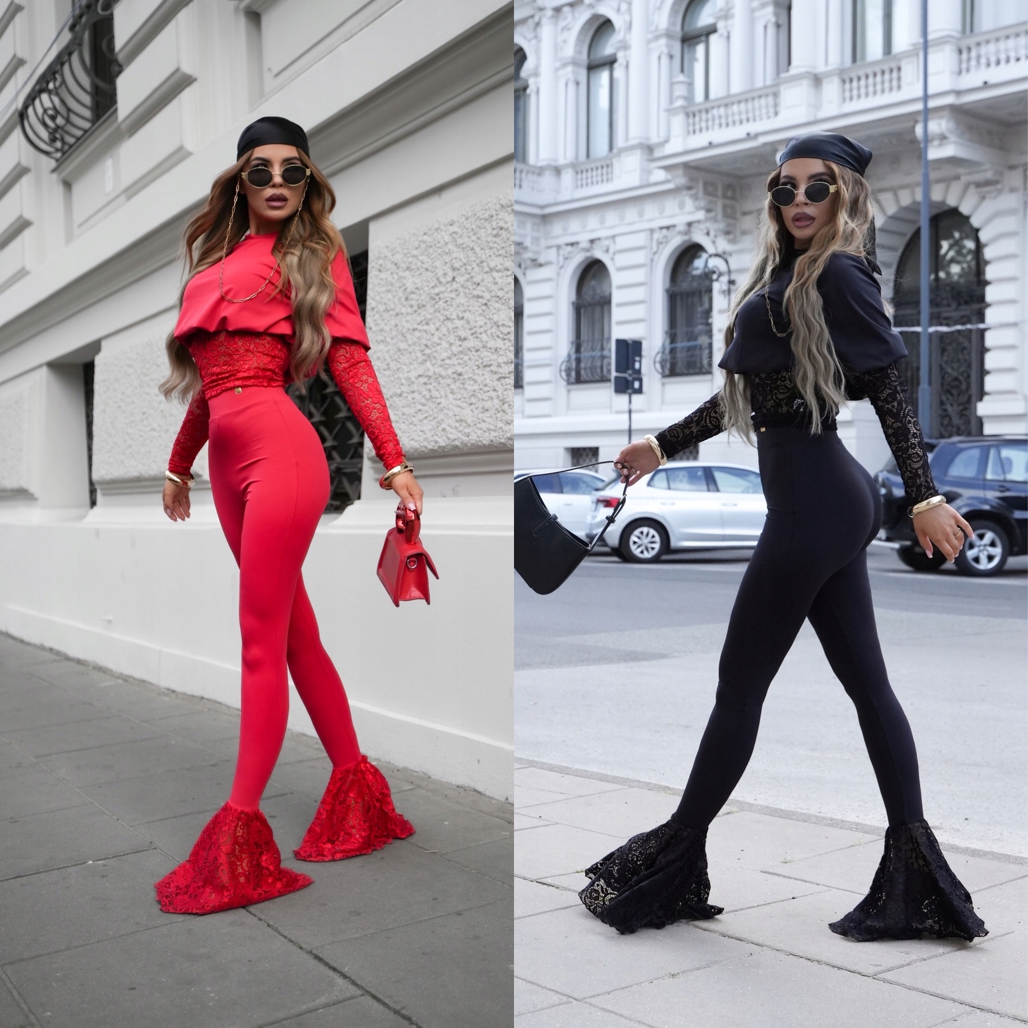 Штани ідеально сидять на стегнах і стегнах, а внизу плавно розширюються до ефектного низу з такий же, чуттєвий матеріал. мереживо.