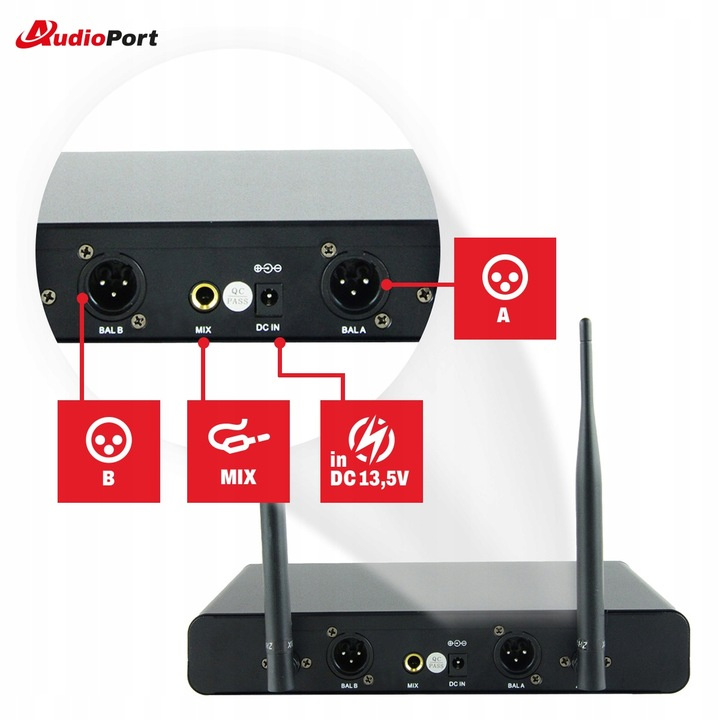 Це дозволяє легко перемикати частоту в разі перешкод. Завдяки роз'єму 6,3 мм (кабель в комплекті) і двом виходам XLR (3-контактний) набір можна підключати до різних звукових систем. Передавачі (накладні) мають дисплеї, що показують обрану частоту та рівень заряду акумулятора, що полегшує роботу, особливо під час професійного використання.