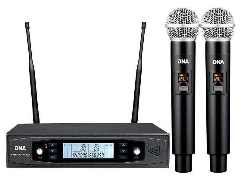 Бездротова система DNA EVENT VOCAL SET – це мікрофонна система, яка включає приймач UHF-хвиль, 2 мікрофони, джерело живлення, батареї AA та кабель джек-джек. Кожен мікрофон живиться від двох батарейок типу АА (входять у комплект), яких вистачає до 8 годин роботи. Мікрофони мають РК-дисплеї, що показують робочу частоту та рівень заряду батареї.