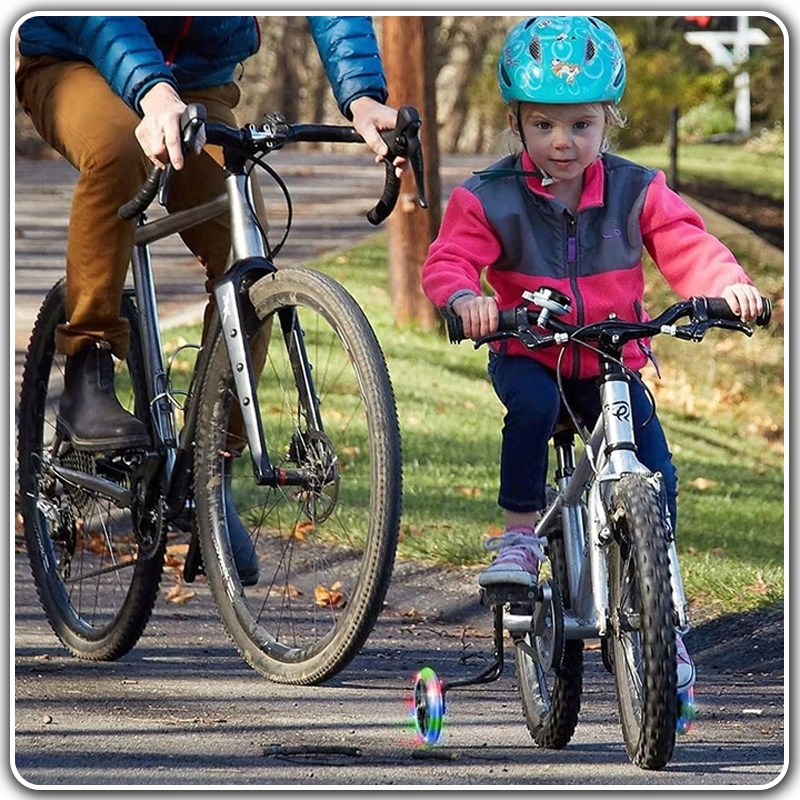 ⭐ СВІТЛОВИЙ ДИЗАЙН: навчальні колеса мають крутий, світиться дизайн, який зацікавить дитину та зробить навчання їзді на велосипеді задоволенням його. Крім того, завдяки підсвічуванню тренувальних колес під час катання дитина стає більш помітною та безпечнішою вночі чи в темряві.