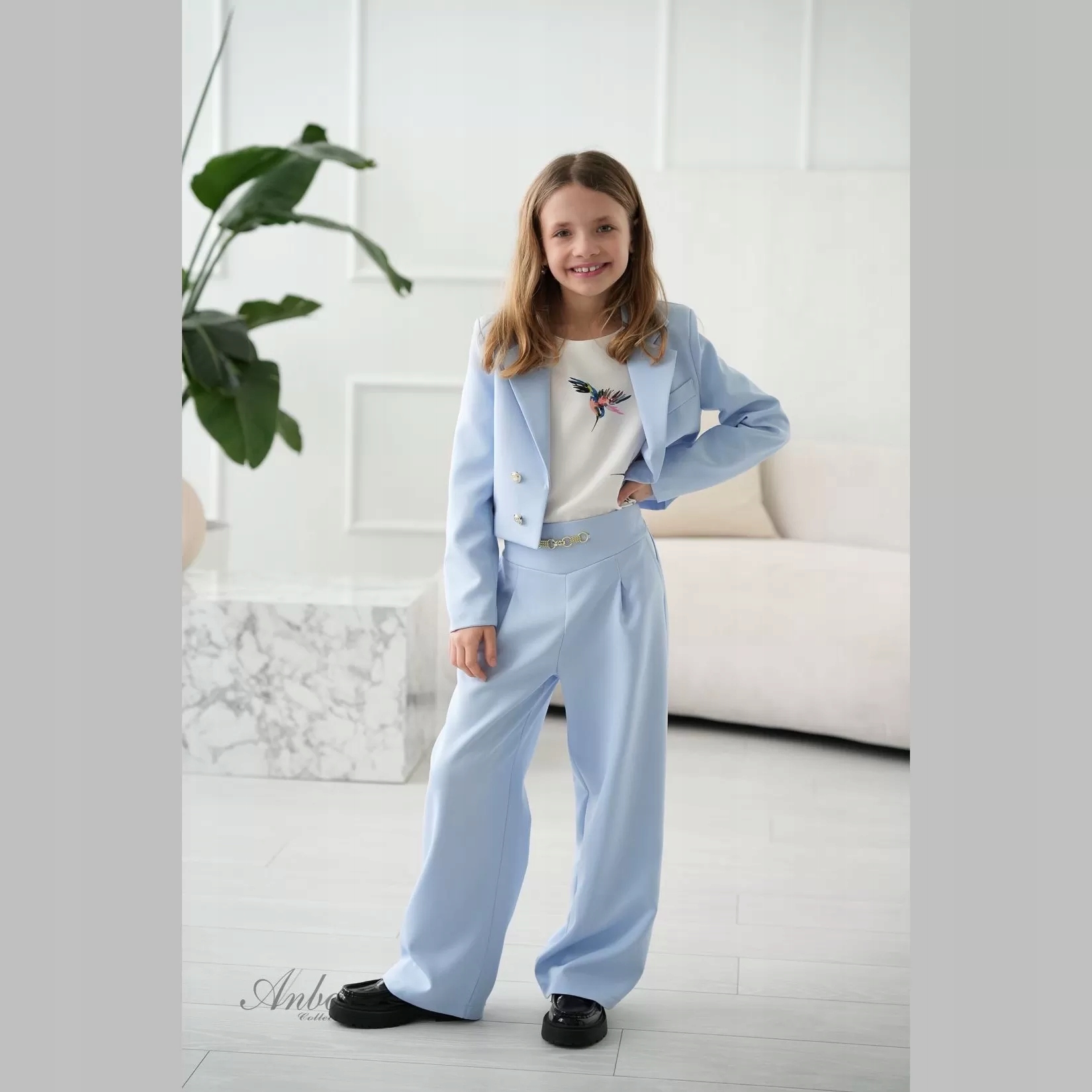 Стильний комплект синього кольору. Комплект складається з піджака з лацканами, імітації кишені для наволочки, 4 золотих гудзиків. Піджак не застібається. У комплект також входять штани, сучасного крою з широкими штанинами, прикрашені золотим ланцюжком на талії. Все це дуже елегантно