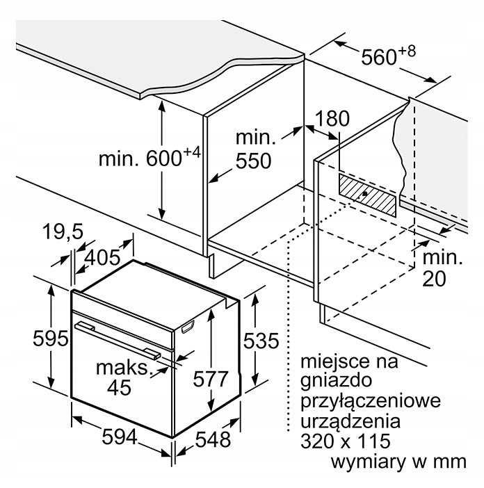 - Розміри ніші (ВxШxГ): 585 мм - 595 мм x 560 мм - 568 мм x 550 мм