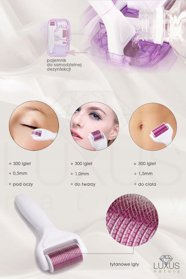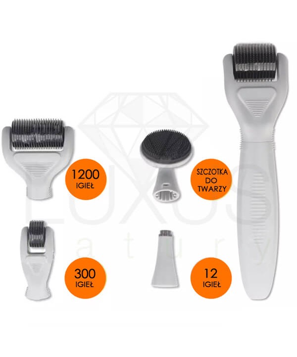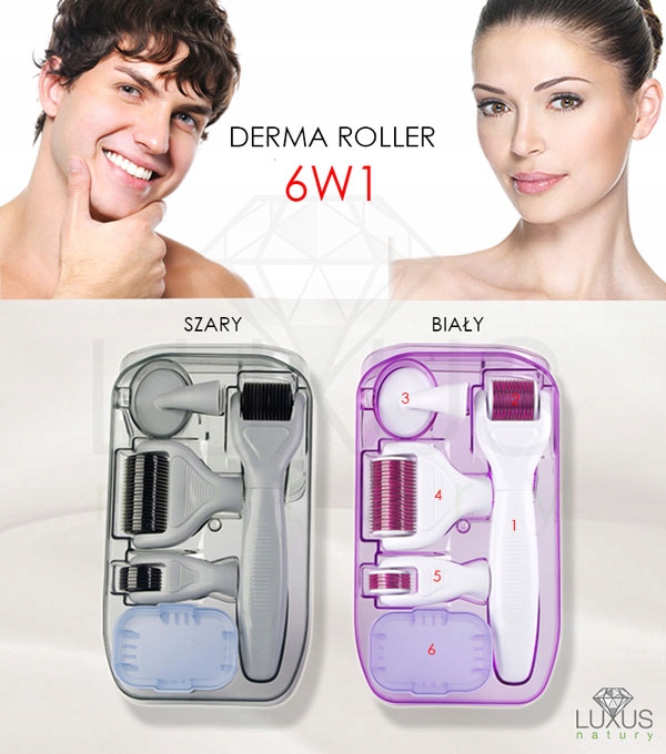 6-в-1 Терапія Derma Roller використовує технологію мікронідлінгу з використанням чотирьох різних голівок: 1200 голок для тіла довжиною 1,5 мм, 720 голок для обличчя довжиною 0,5 мм і 300 голок для області очей довжиною 0,5 мм. як перфоратор з 12 голками, який використовується головним чином для введення активних речовин глибоко в шкіру та в місця, де ми хочемо привернути особливу увагу, наприклад, шрами. Це ефективна система доставки активних інгредієнтів до епідермісу та підшкірної клітковини, завдяки чому активні інгредієнти ефективно живлять шкіру.