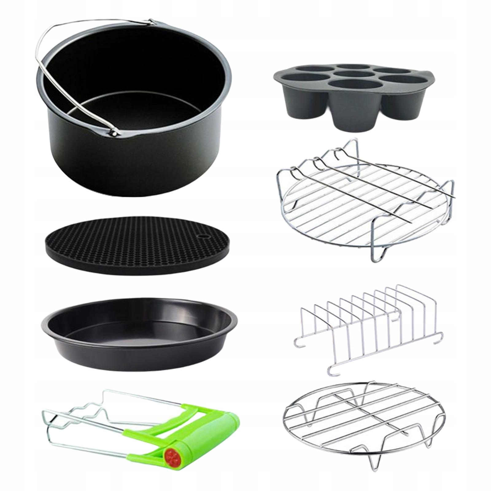 Набір аксесуарів для фритюрниці: в тому числі форма для торта, відерце для торта, форма для піци, силіконовий килимок, затискач для посуду, решітка для хліба, сталевий металевий тримач, сталева металева підставка