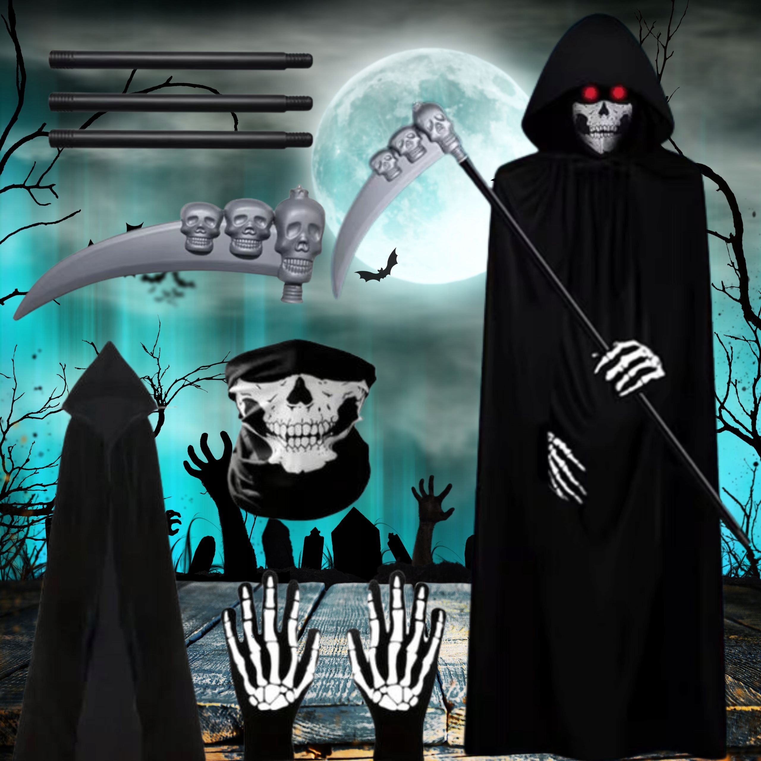 - Повний комплект - в одному пакеті ви отримуєте все необхідне для створення вражаючого костюма на Хелловін: накидку з капюшоном, маску, рукавички та косу!