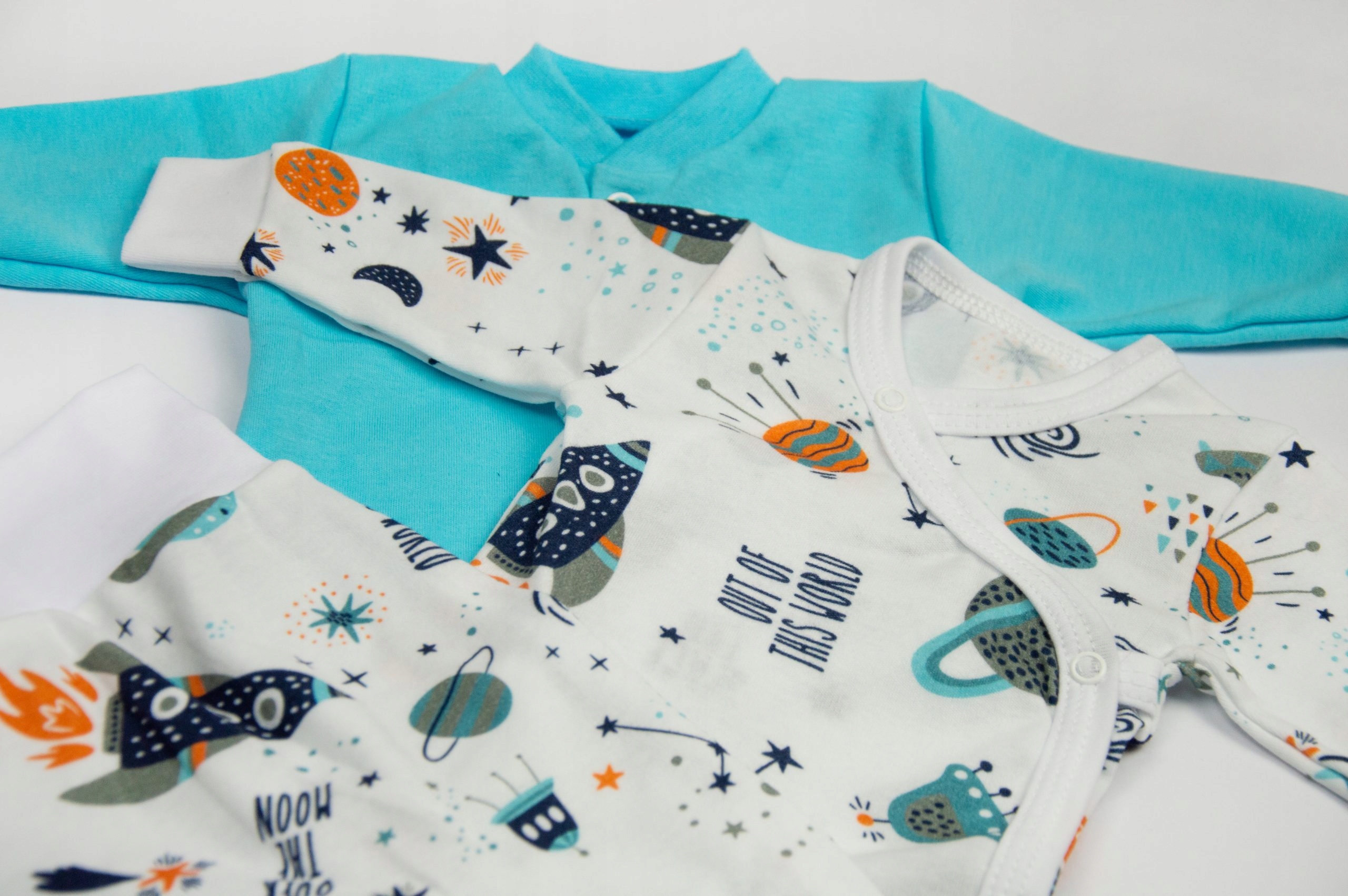 - чарівний БОДІз довгими рукавами та вирізом «конверт», який не вимагає надягання одягу через голову дитини; він білий із зображенням планет і ракет
