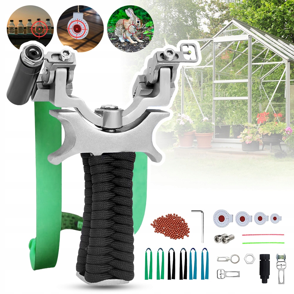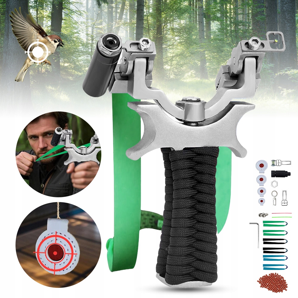 💯💯 Рогатка з нержавіючої сталі з головою, що обертається на 360°, 6 гумових стрічок, 300 глиняних кульок