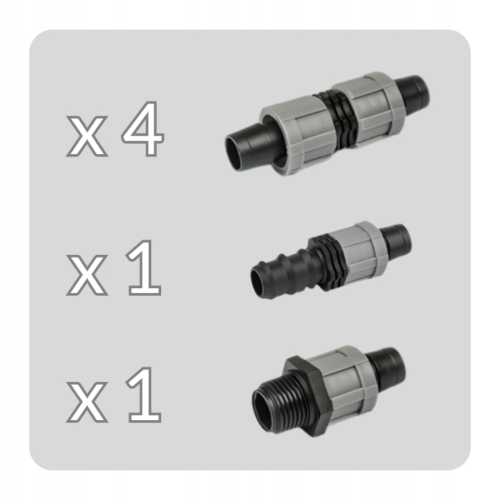 Усі елементи в комплекті сумісні зі шлангами та трубами діаметром 16 мм. Їх можна використовувати в поєднанні з підвідною трубою довжиною 100 метрів і діаметром 16 мм.