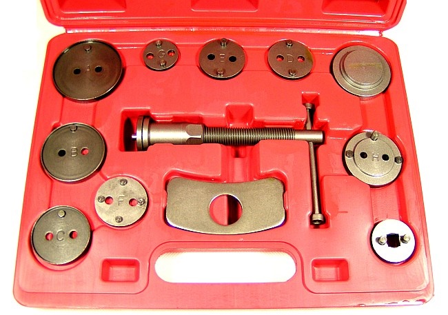 Професійний набір з 11 предметів для реверсування/віджимання поршнів у циліндрах гальмівної системи, необхідний при ремонті автомобілів з дисковими гальмами.
