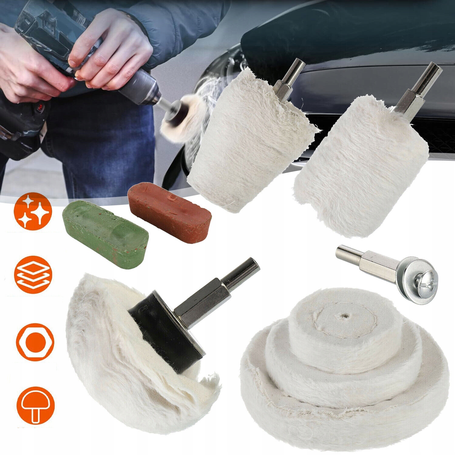 【хороша продуктивність】 Поліроване кріплення може видалити окислення поверхні, іржу, дьогтю та всі види бруду і дати вицвілі предмети новий блиск. Підходить для остаточного полірування металу (сталі, алюмінію, сплавів, хрому, латуні), деревини, пластику, кераміки, скляних та пофарбованих поверхонь.