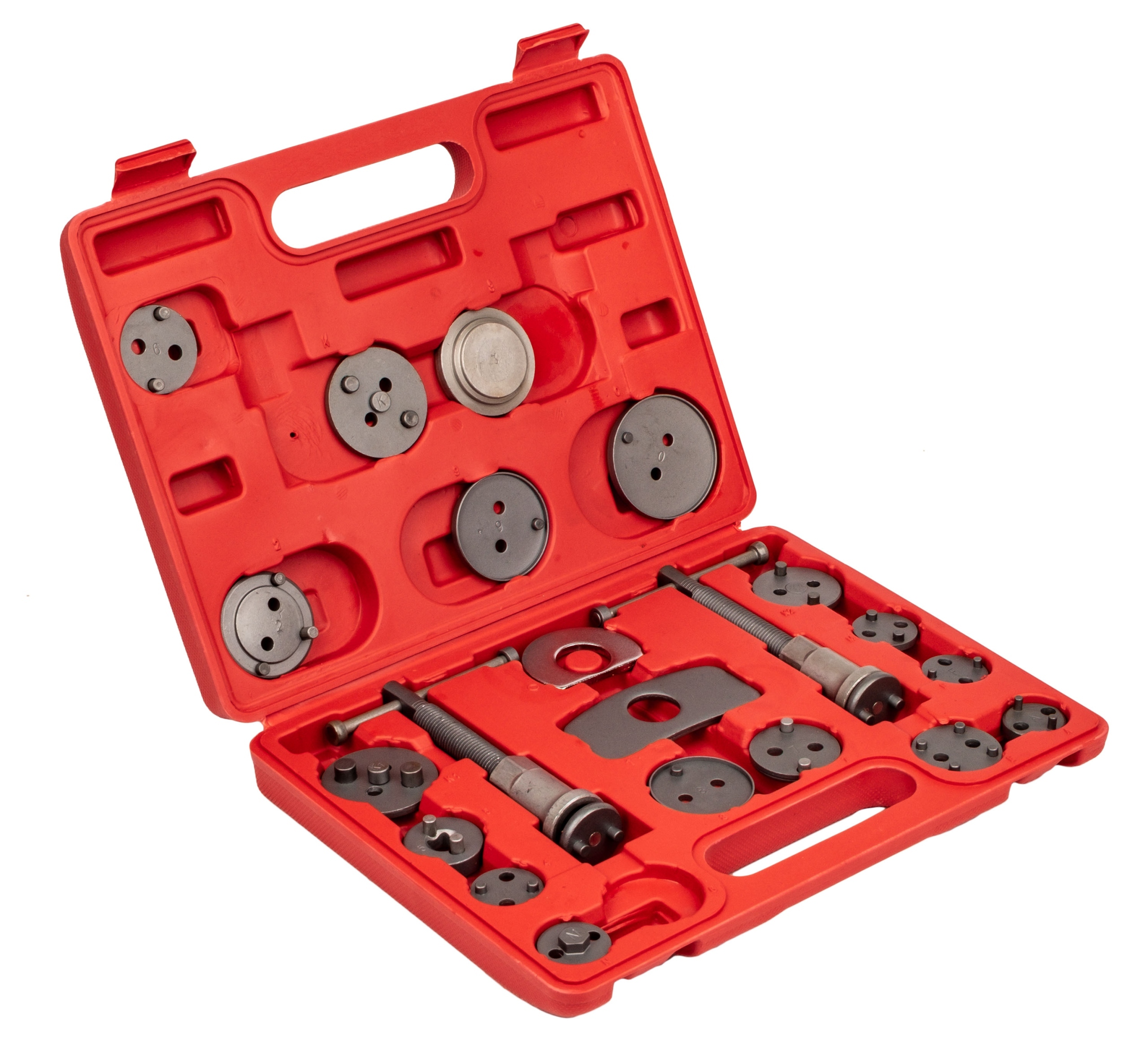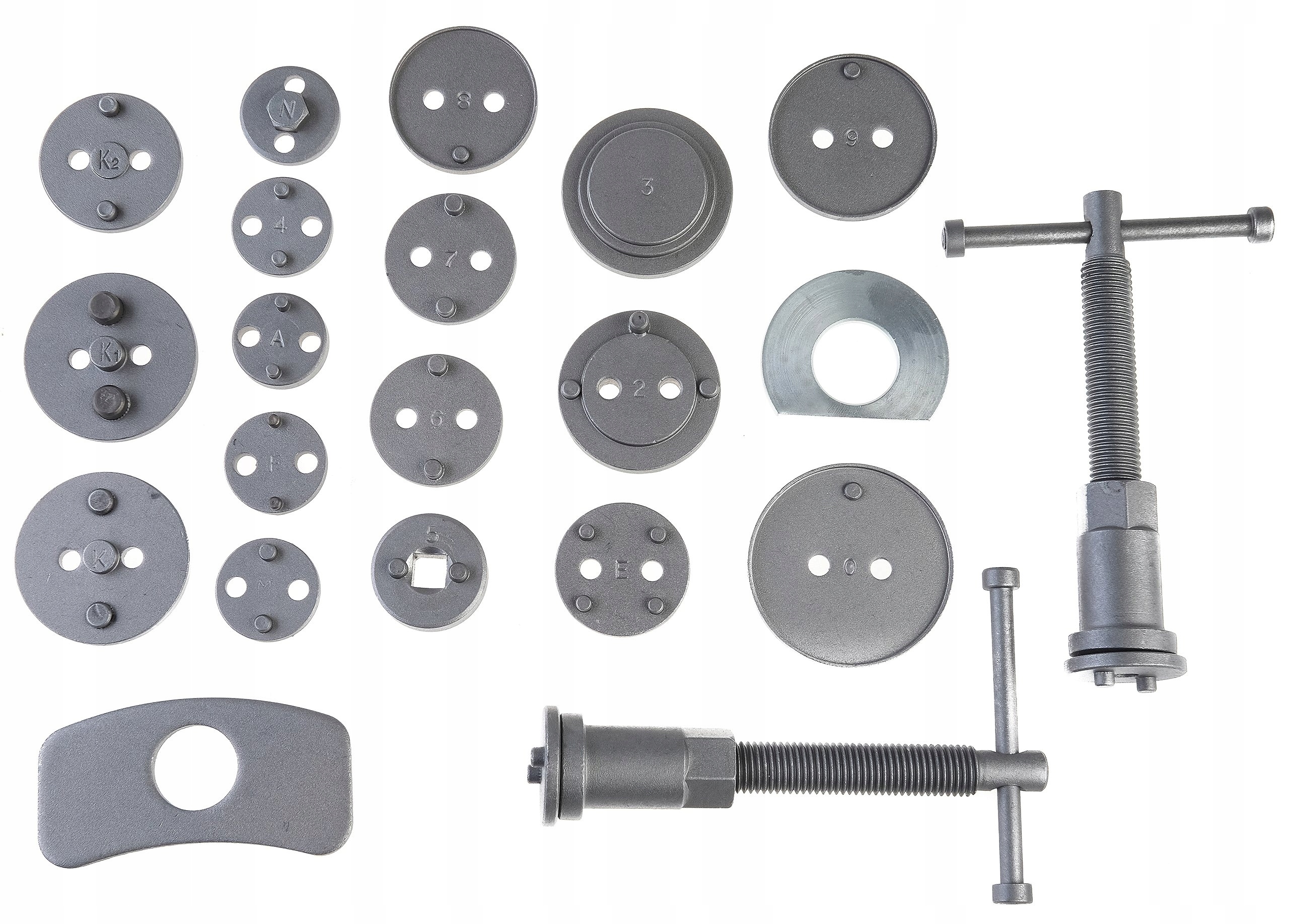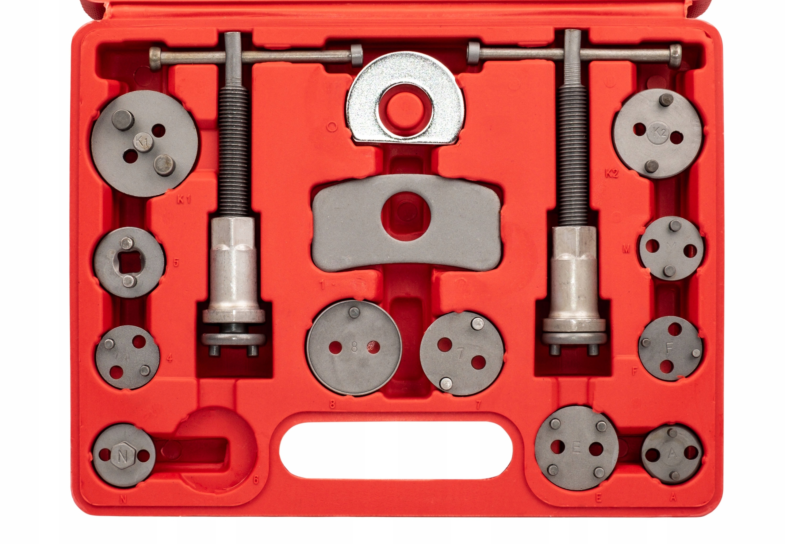 - У набір входять два преси (правий і лівий поворотний), дві різні за формою балки для притиску преса до сідла супорта і 17 адаптерів, адаптованих до розміру гальмівних поршнів, які використовуються в більшості легкових автомобілів, що випускаються на європейському та азіатському ринках. .