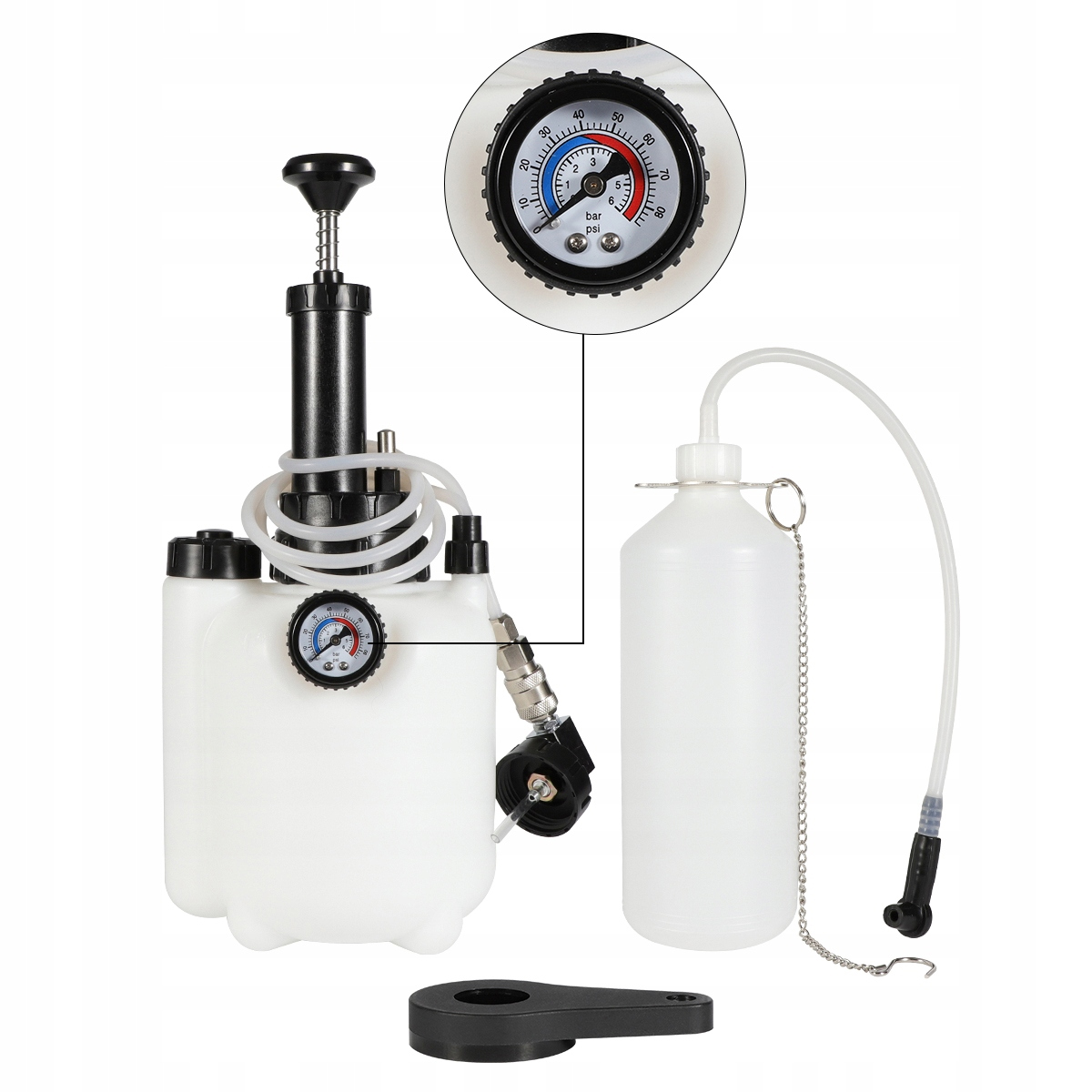 Якщо в гальмівній системі є повітря, гальмівна рідина стане вологою та зіпсується. Заміна гальмівного циліндра буде складною і може призвести до відмови гальм. Тому гальмівну рідину слід регулярно перевіряти та замінювати, щоб забезпечити належне функціонування. Цей 3-літровий набір для прокачки гальмівної рідини підходить для роботи однією людиною без сторонньої допомоги для ефективного, швидкого та надійного видалення повітря та використаної гальмівної рідини з гальмівних ліній. Підходить для більшості популярних європейських автомобілів.