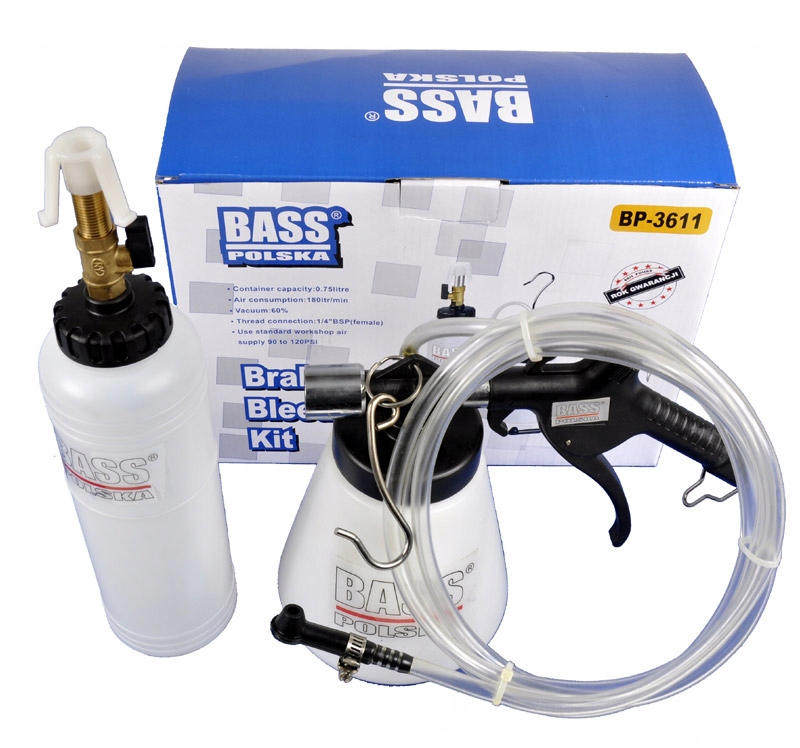 Набір дозволяє одній людині заправляти та прокачувати гальмівну систему за допомогою тиску пневматичної системи (компресора).