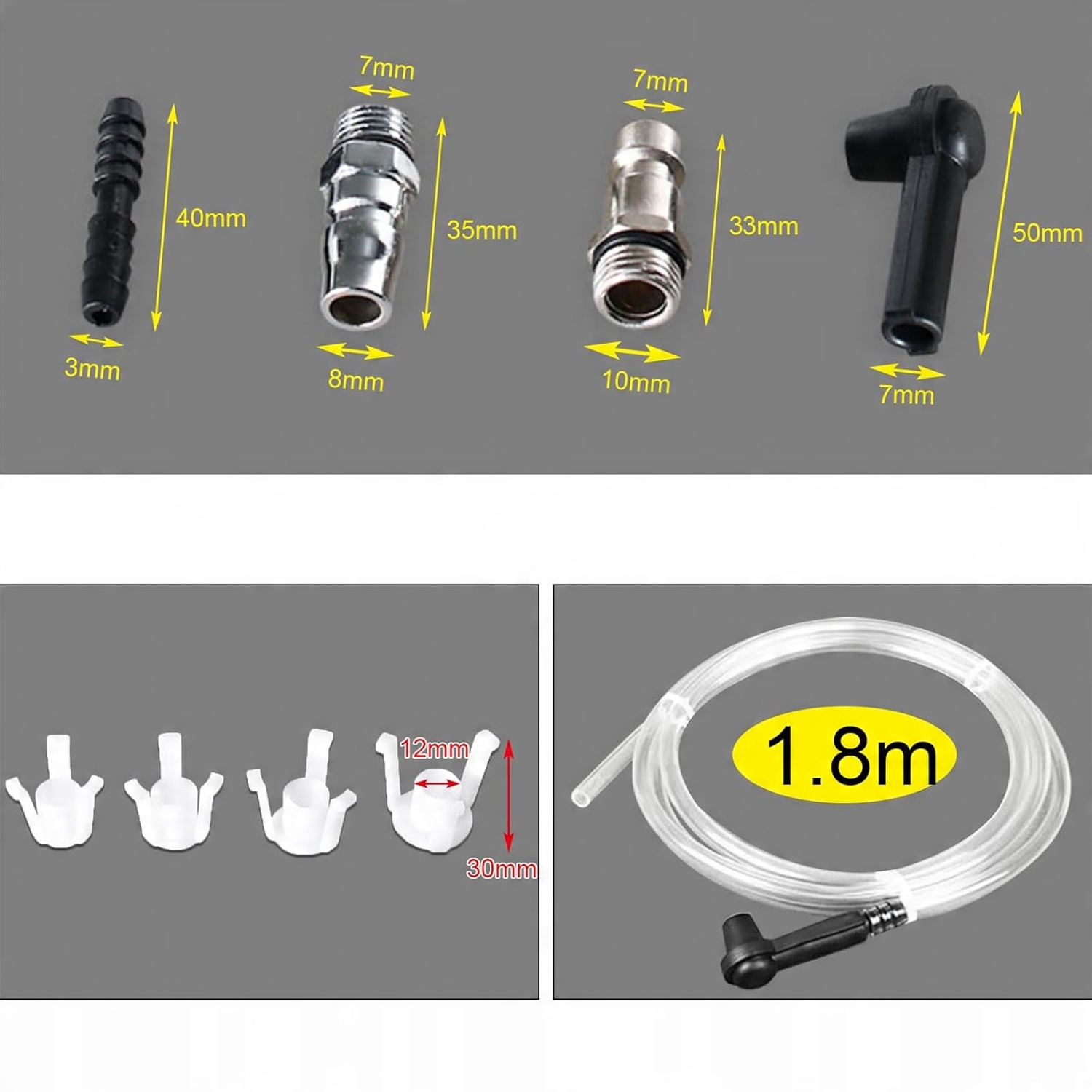 - 🔧 У набір входять 4 різні адаптери для пляшок, які ідеально адаптуються до застосування. Прозорий зливний шланг дозволяє візуально контролювати видалення старої рідини.