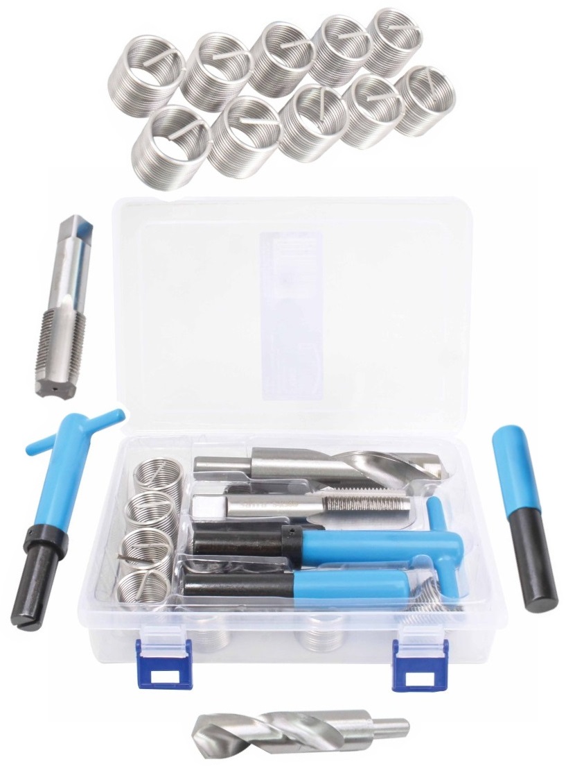 встановлено для ремонту пошкоджених нитків у двигунах та інших елементів транспортного засобу. Свердла та нитки виготовлені з високої швидкості сталі HSS. Нитки для однієї -сцені вирізають нитку, в яку вводиться спіральна вставка з твердої нержавіючої сталі. Ручка свинцю та машина для стука, яка розбиває виступаючий кінчик вставки.