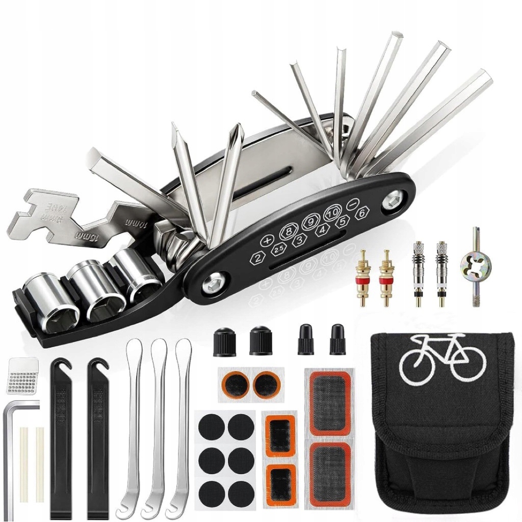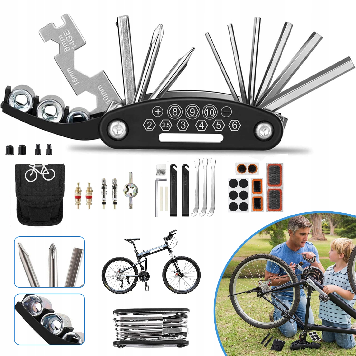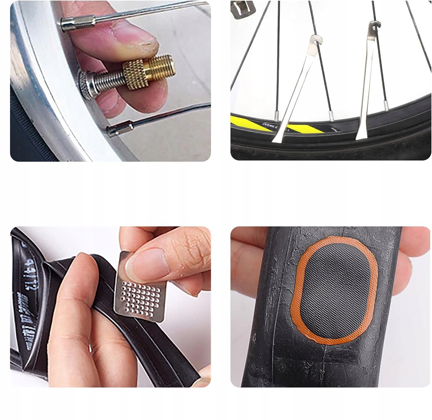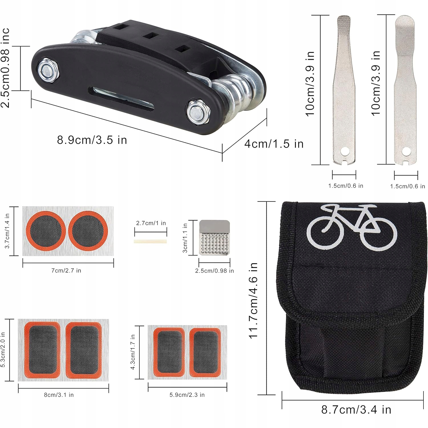 🚲🚲 Велосипедний інструмент 16 в 1: Набір ремонту відмови (3 важелі шини / 2 нейлонових штовхів / 12 патчів шин / 1 металева шина), 2 вставки клапана, 1 шапочка.