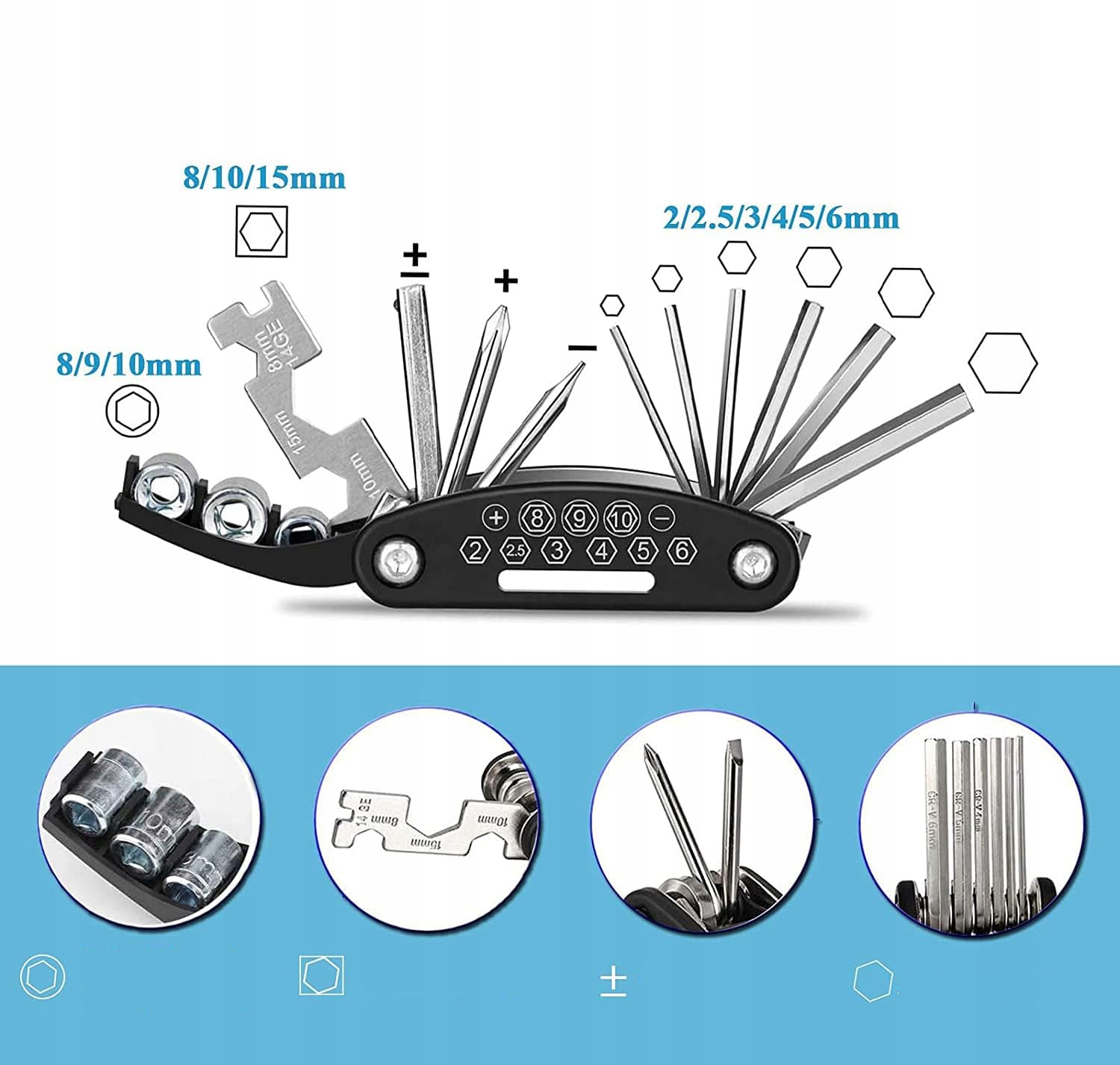 🚲🚲 Багатофункціональний комплект для відновлення велосипедів: Клавіша Allen 8/9/10/мм, плоска викрутка, тевтонська викрутка, палиця, що розширює рукав, плоский ключ 8/10/мм, ключ від розтягування/14 ге, клавіша Allen 2/25/5/5/6 мм. Виготовлений з високоякісного матеріалу, довговічного, повністю функціонального, компактного та легкого, легкого для перенесення.