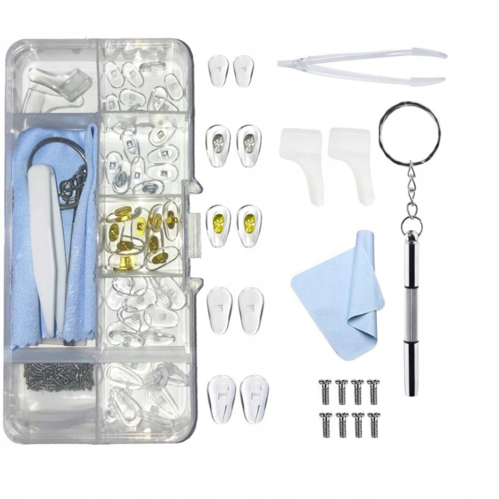 【Повний набір для ремонту окулярів】 Цей набір для носа окулярів включає 30 пар змінних носоупорів 5 стилів, 1 викрутку для окулярів, 60 гвинтів, 1 вигнутий пінцет, 1 серветку для чищення, 1 a накладки на ніжки окулярів.