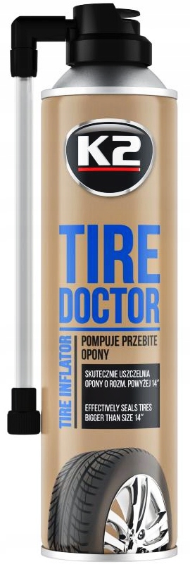 K2 Tire Doktor швидко та ефективно накачує і герметизує пробиті шини - тимчасовий ремонт без розбирання та використання інструментів. Аерозоль накачує шину, а спеціальна латексна формула закриває отвір. Препарат не впливає на балансування коліс. Накачує більшість шин, протестовано на 235/70/16.