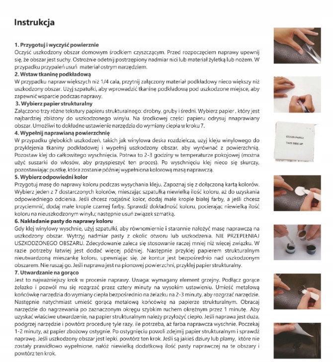 - Усуває та відновлює пошкодження шкіри, вінілу тощо.