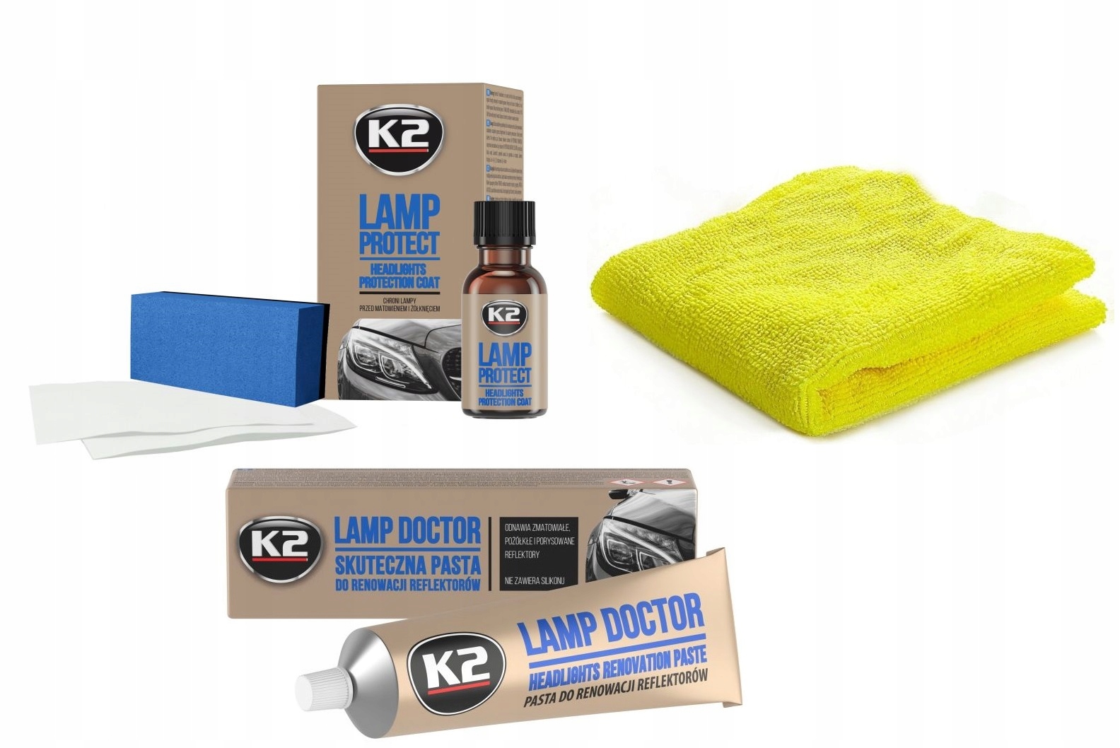 Ідеальним доповненням до пасти K2 LAMP DOCTOR є захисне покриття для фар K2 Lamp Protect, яке захищає лампи від матування, пожовтіння, подряпин і УФ-променів протягом року після нанесення покриття.